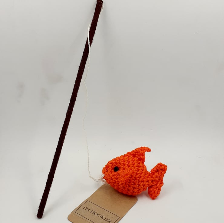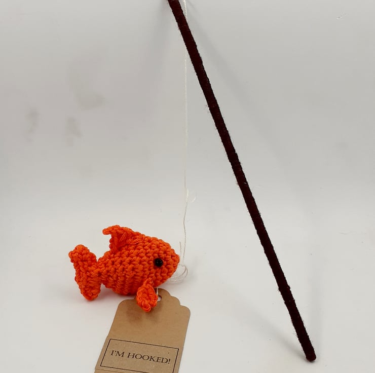 A change from a greetings card - send a message on a stick! The fish has been crocheted in cotton and filled with polyester stuffing. It has beady glass eyes and is caught on a fishing rod made from a bamboo stick wrapped in wool-rich yarn. The tag reads 'I'm hooked!' although I am very happy to exchange this tag for one with a message of your choice. The fish measures approximately 6 cm long.