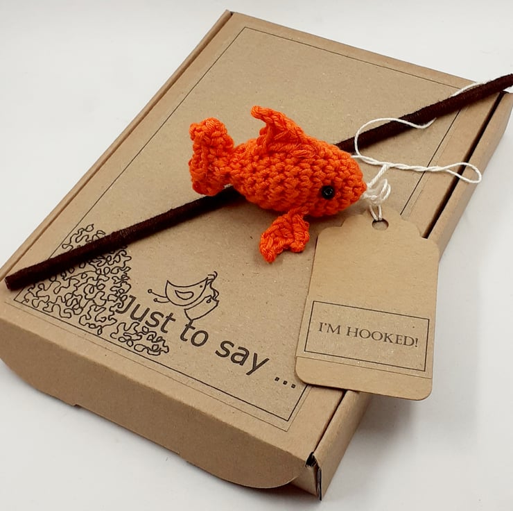 The fish and the rod it's attached to, come wrapped in tissue in a labelled PIP ( Postage in Proportion ) box all ready to be given or posted on.