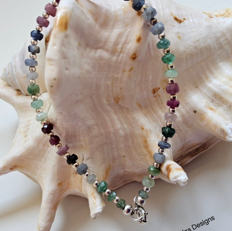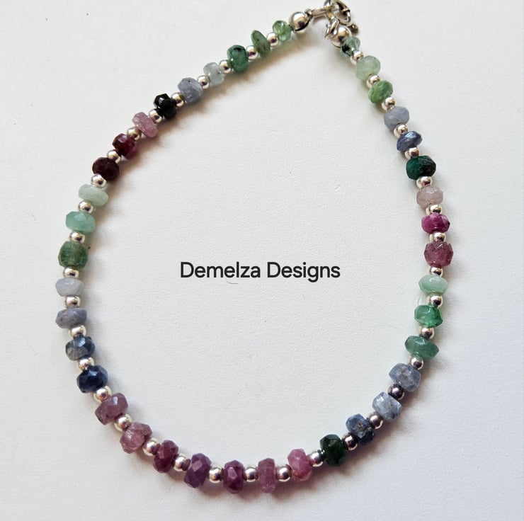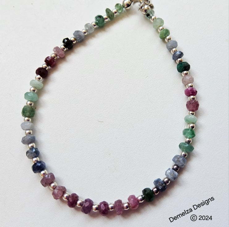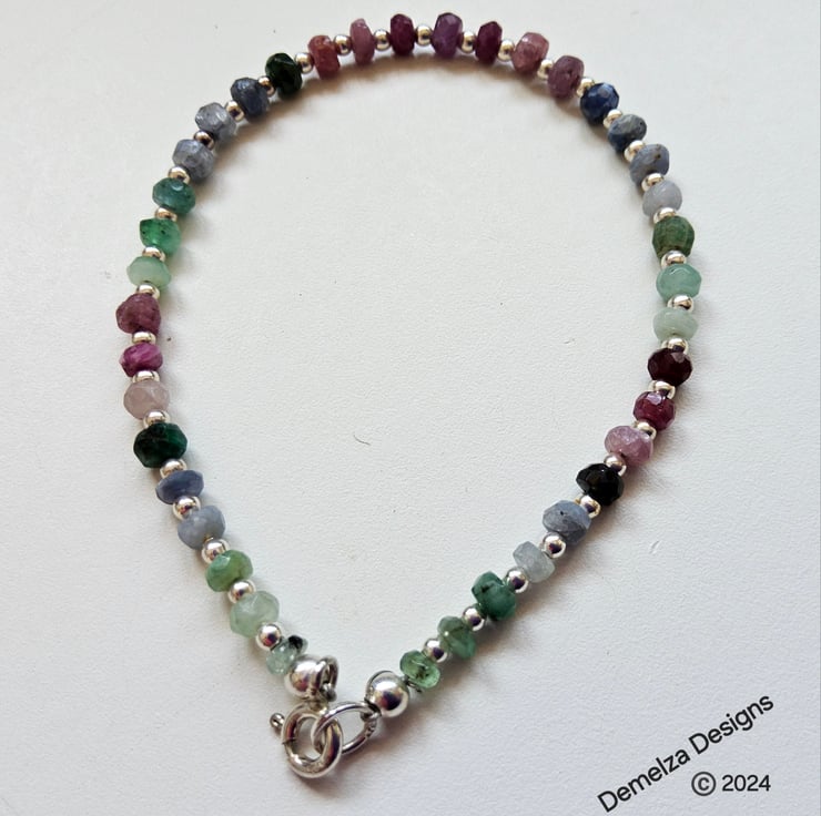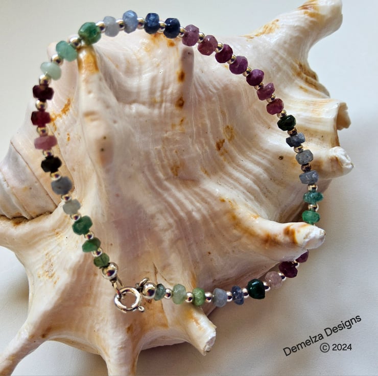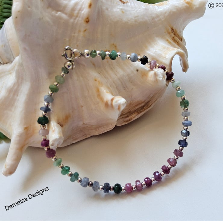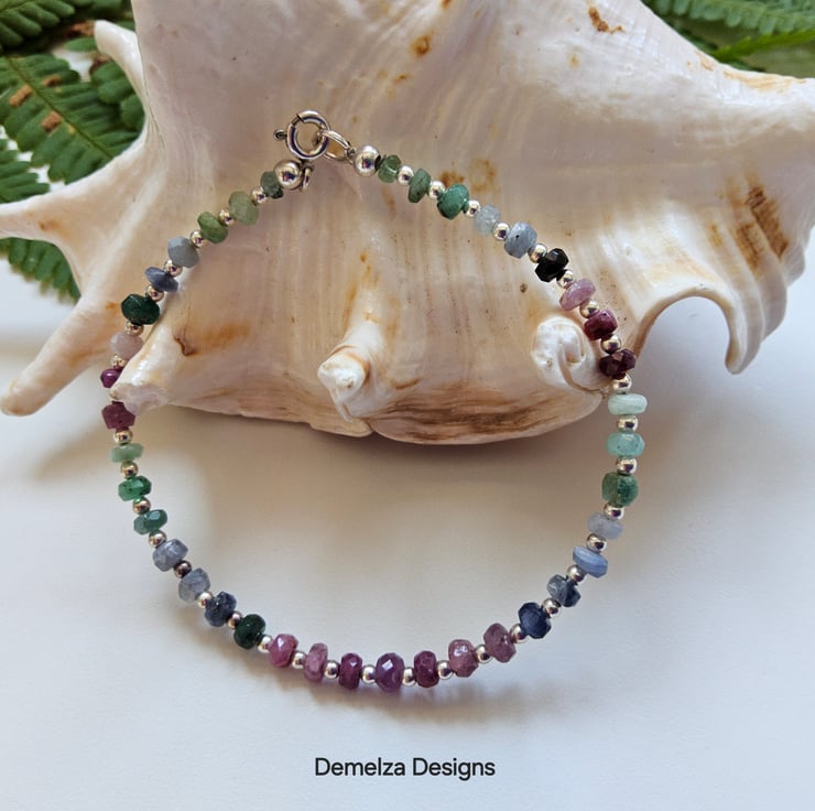 A very sweet feminine bracelet designed and hand crafted in Cornwall. The ruby, blue and pink sapphires and emeralds are free faceted rondelle cut genuine gemstones which slightly graduate in size from front to back. Between each one is a sterling silver bead for added luxury and sparkle.