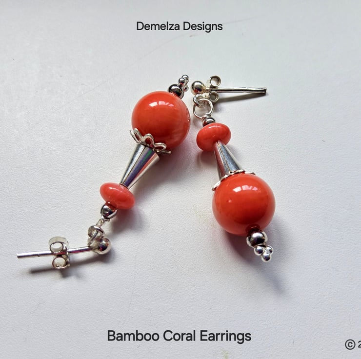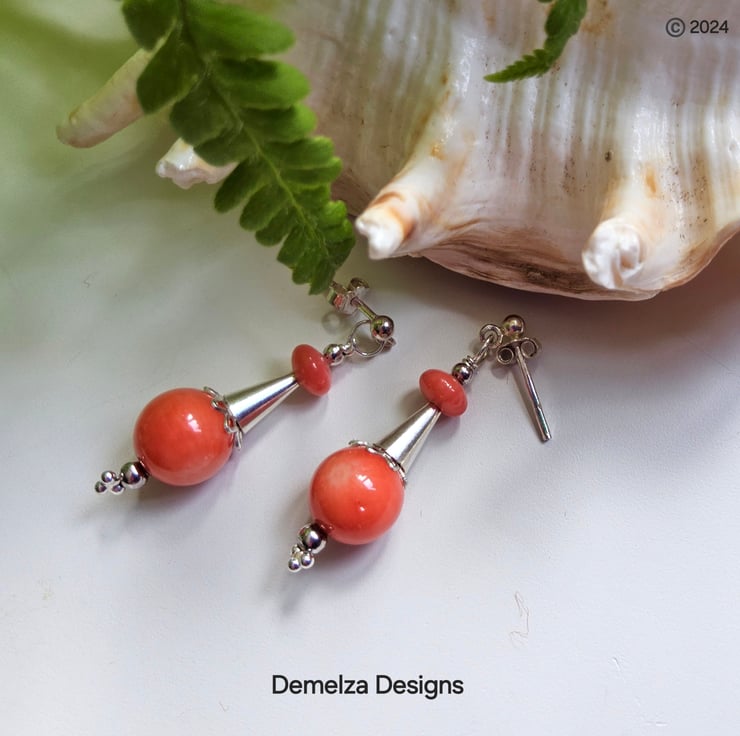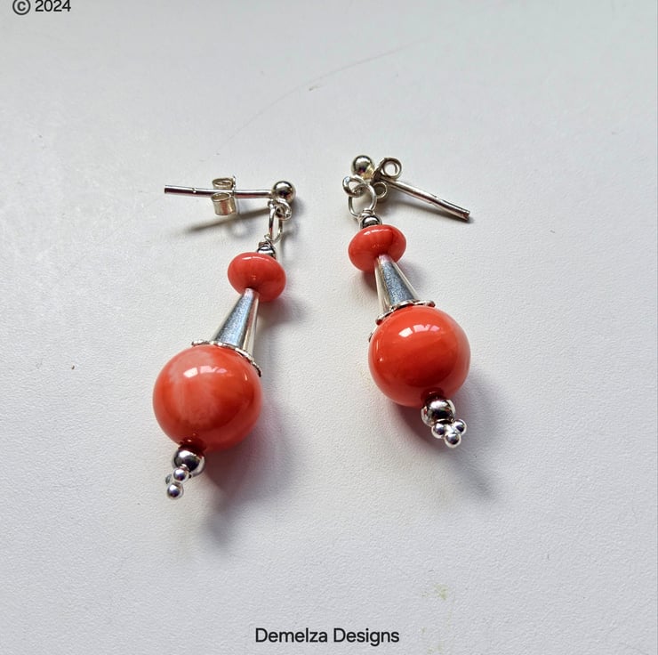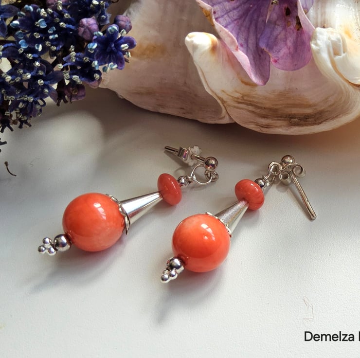 A very unique pair of earrings designed and hand crafted in Cornwall. They have been created using large 10mm coral rounds complimented with smaller rondelle cut coral gemstones. All components used to hand craft these earrings are 925 sterling silver.
