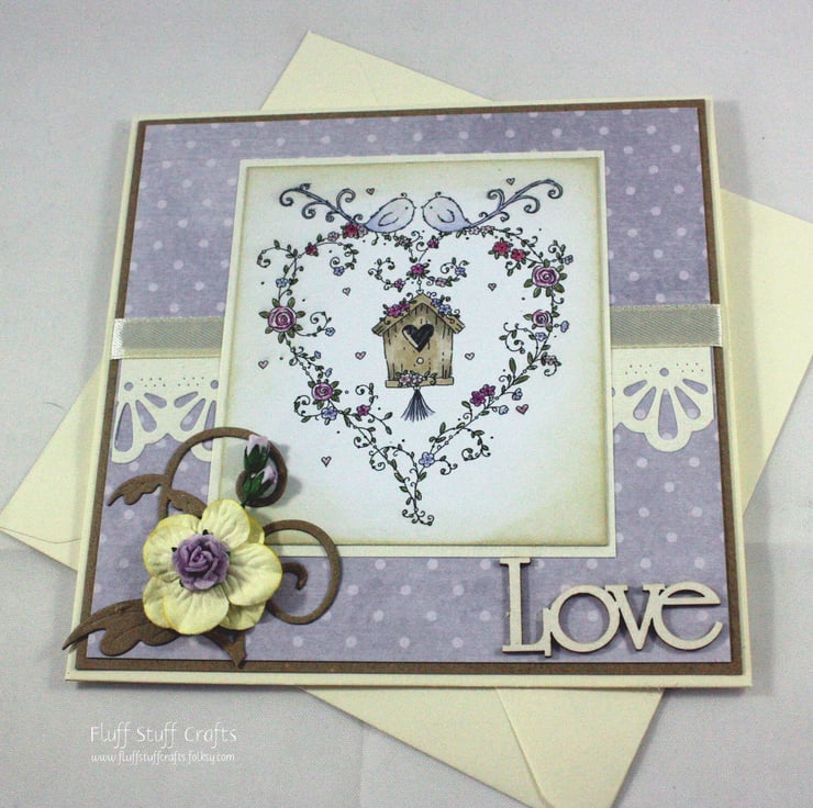 Square card suitable for Valentine's Day, an engagement or anniversary, or even a wedding. The card features a hand coloured image of two birds above a heart shaped floral arrangement surrounding their bird house.
