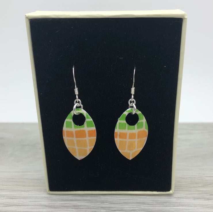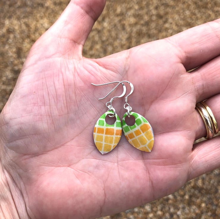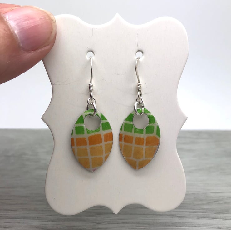 Super light weight aluminium scales have been hand decoupaged it pretty Decopatch paper and then covered with a number of layers of cold enamel. These hang from sterling silver fish hook earrings using sterling silver jump rings. The back of the scale remains blank, silver in colour.