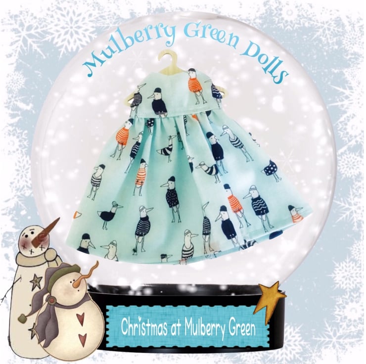 A cute little dress to fit the Mulberry Green characters in a really unusual birds in striped jumpers print. The dress is made from best quality cotton, has a full skirt, a lined bodice and comes on a cute little wooden hanger.