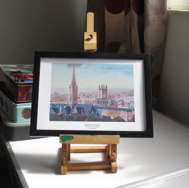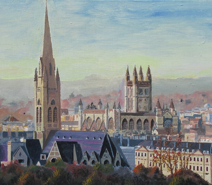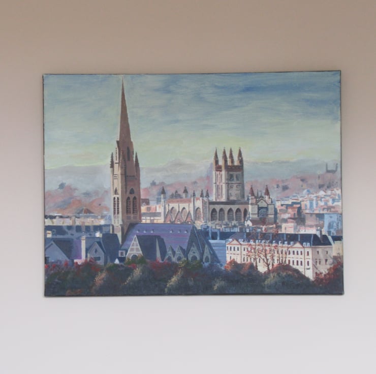 Morning, the city is quiet and peaceful. Bath City a famous city in N.Somerset UK, Georgian houses, The Roman baths, Cathedral and thriving shopping and social and entertainment centre. The cityscape acrylic painting may be an interesting wall hanging for your house, flat office or reception.