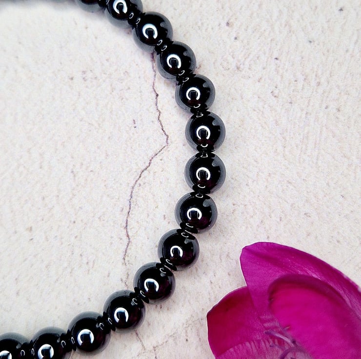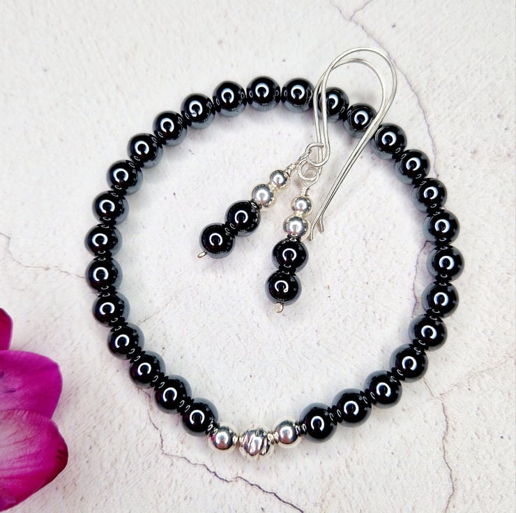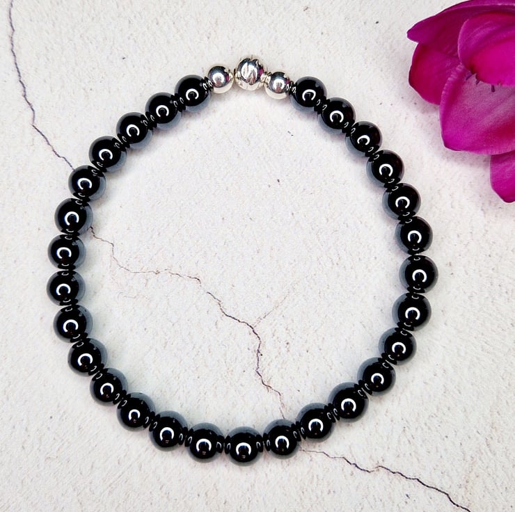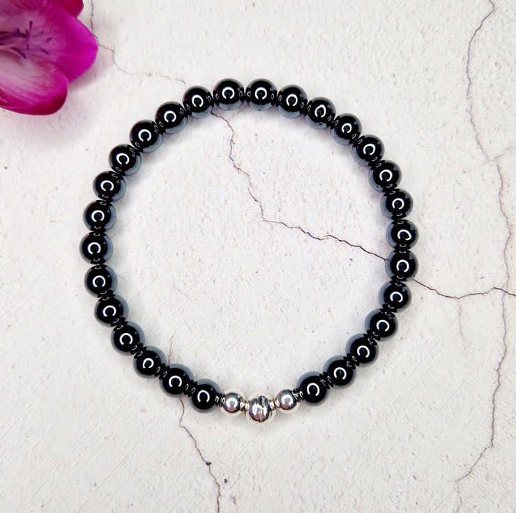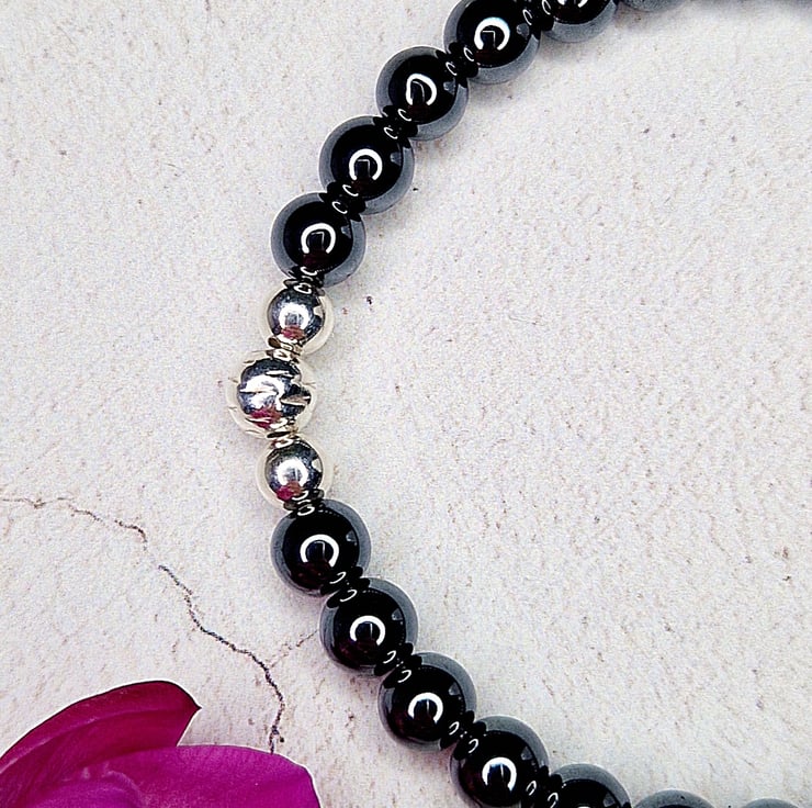 This bracelet is made of 6 mm hematite beads that are an even dark grey and have a deep metallic shine. The bracelet has an accent of one 6 mm hammered silver bead with plain 5 mm beads either side. All the silver components used in this bracelet are sterling silver.