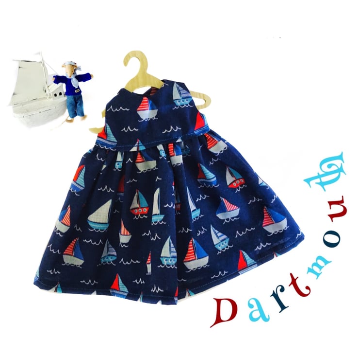 A smart navy sailing boat print dress, to fit the Mulberry Green characters. The dress is made from polyester cotton, has a full skirt, a lined bodice and comes on a cute little wooden hanger.