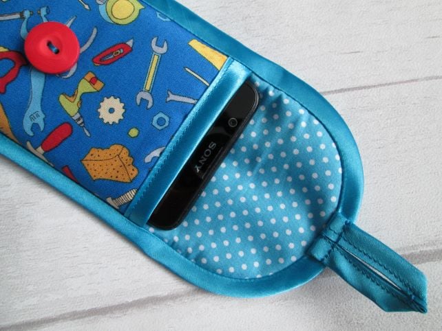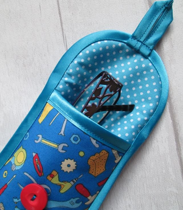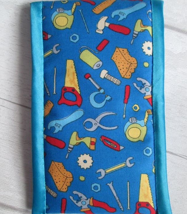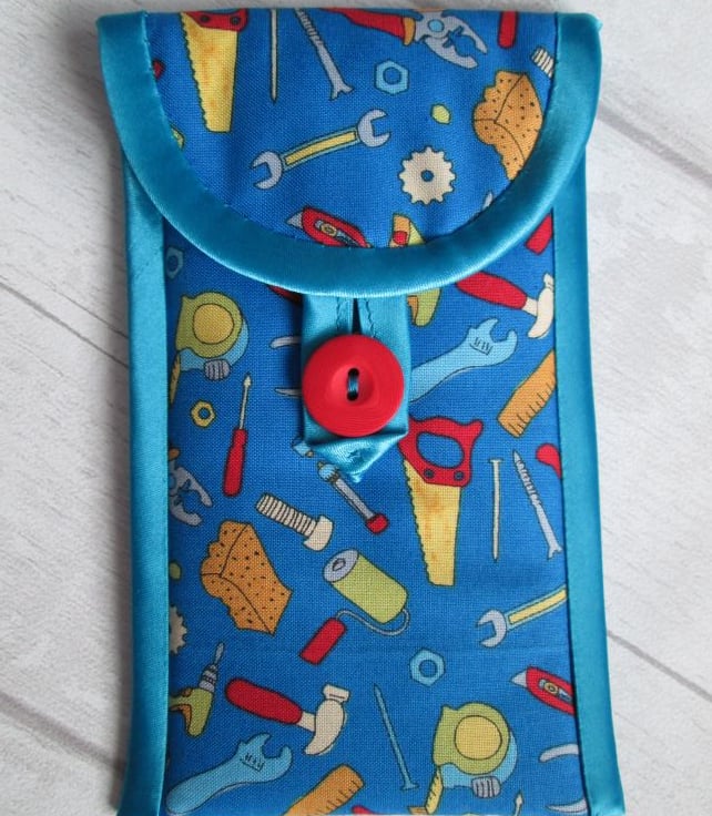 A fun, but practical, glasses or phone case for a builder, plumber, keen DIYer etc.. The outside is a cotton print of tools on a bright blue background and the lining white spots on turquoise blue. Lightly wadded to protect the contents, it is finished with blue bias binding and a loop and button fastening.
