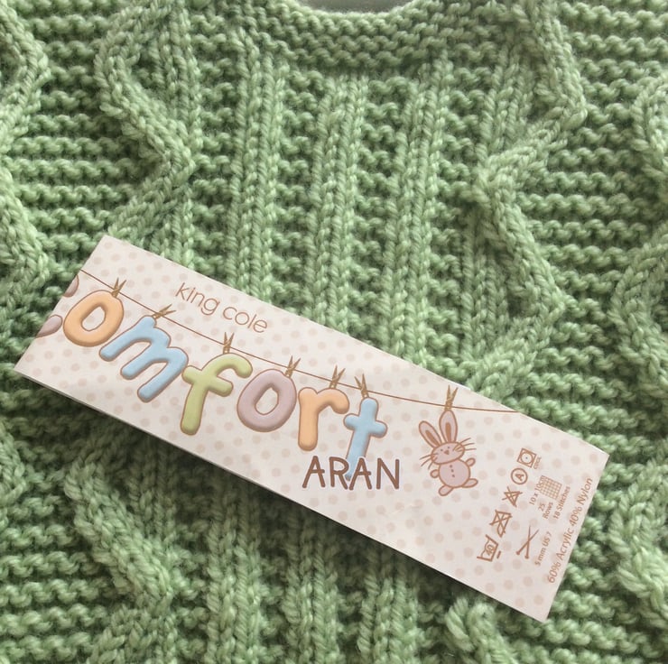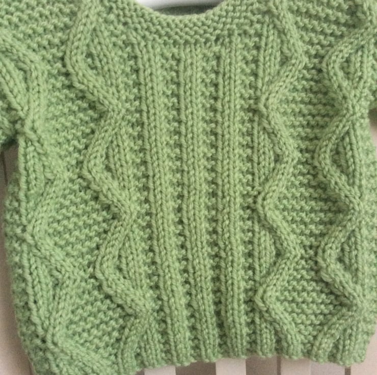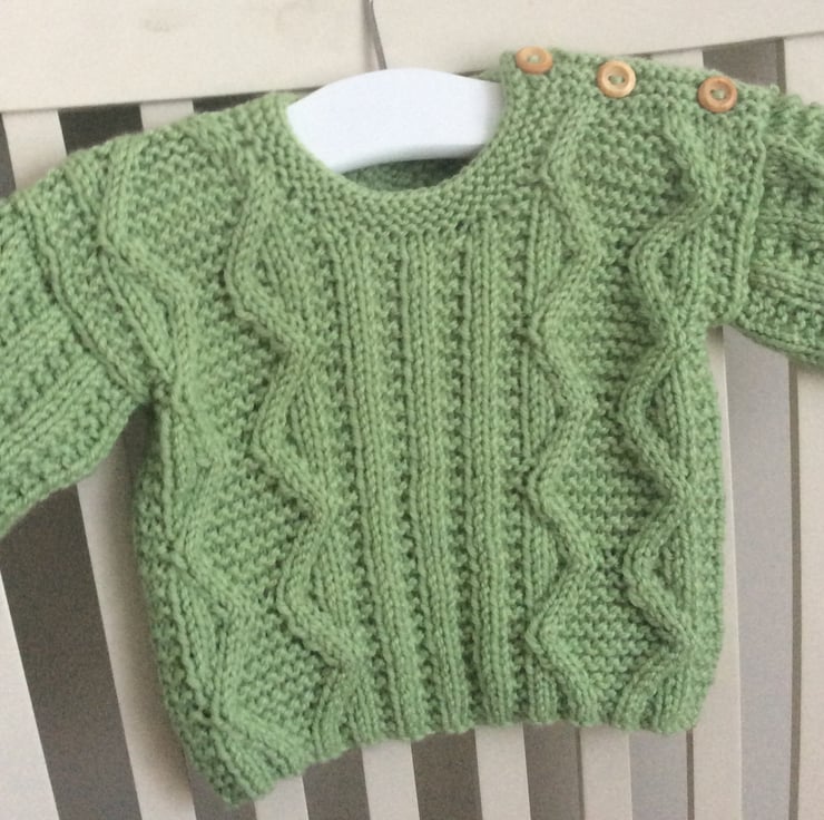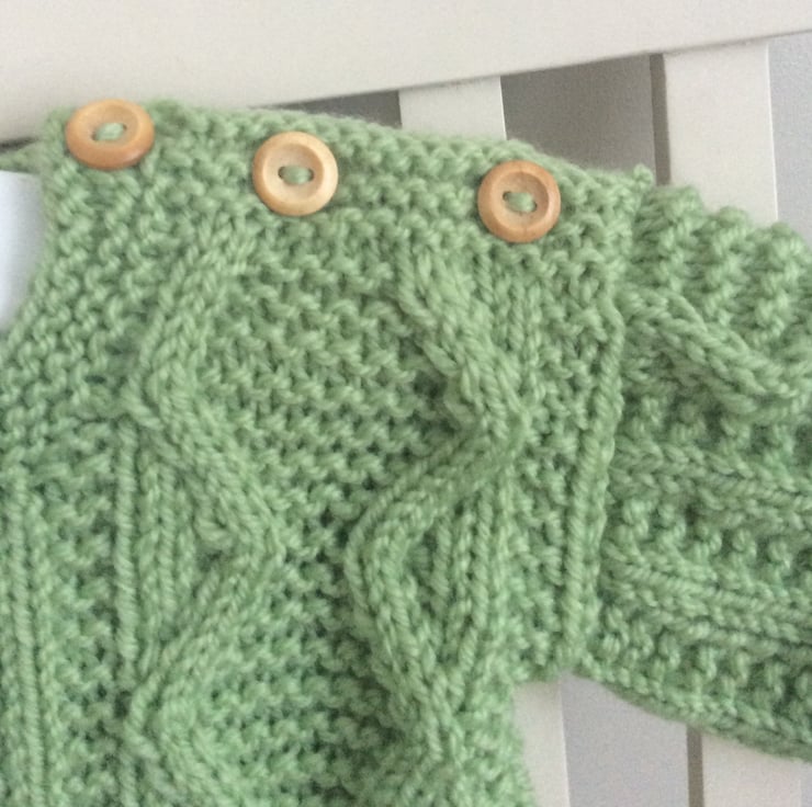 Very sweet aran style baby jumper in a gorgeous shade of green, called dill. I’ve followed an attractive vintage pattern and used a very soft and practical top quality baby yarn to hand knit this little jumper. The shoulder fastens with three wooden buttons and makes for easy dressing of your little one. Would suit either a boy or girl and would make a very welcome gift for a new baby. To fit a baby up to approximately 6 months.