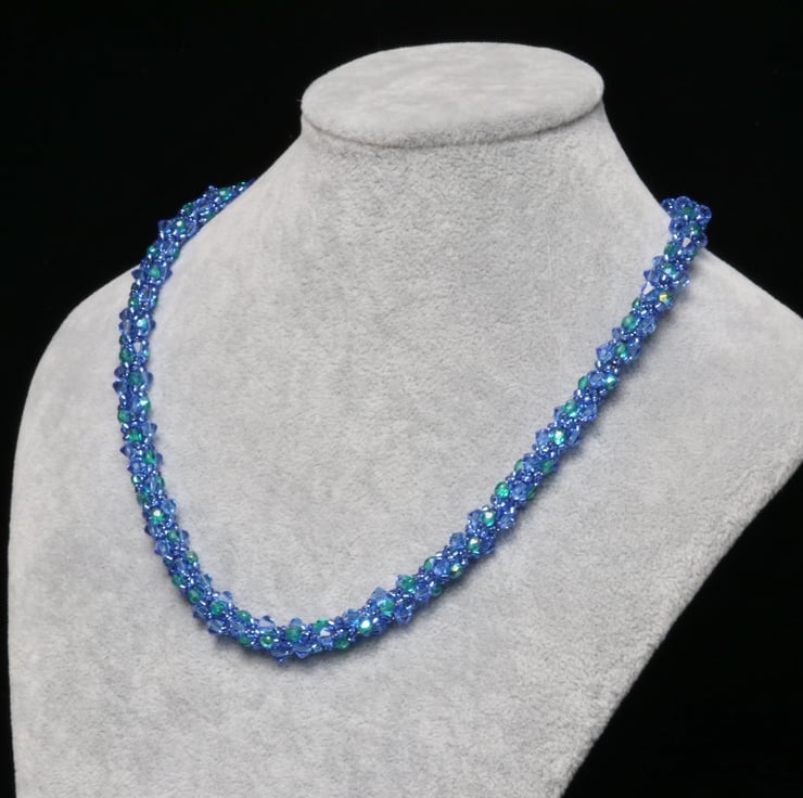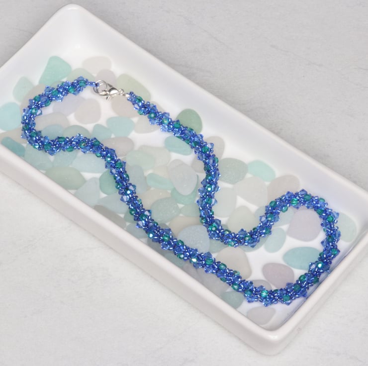 Sapphire Blue with a Touch of Green Crystal Spiral Weave Necklace