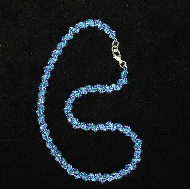 The pattern I have used for this necklace is a basic spiral weave beadweaving pattern, but the crystals take it into a new dimension and give it a lot of class. A silver-plated trigger clasp completes the piece. The necklace has a very soft drape so sits well on the neck.