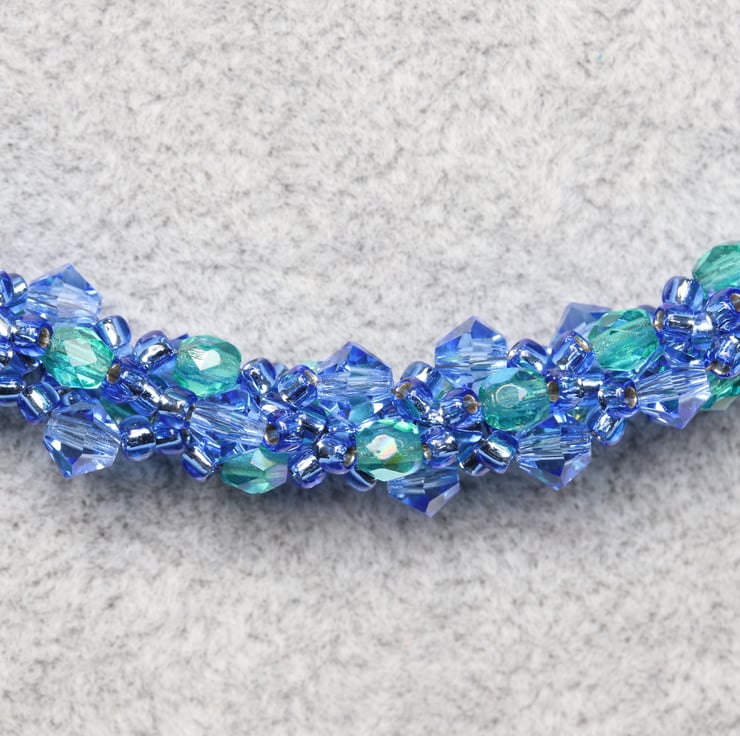 This sparkly necklace is made from 4mm Preciosa bicone crystals in beautiful sapphire blue, teamed with 4mm emerald green firepolish beads and silver lined sapphire blue seed beads. Both the blue and the green 4mm beads have an AB coating for extra sparkle. The overall effect is that of a glittery blue necklace with green highlights.