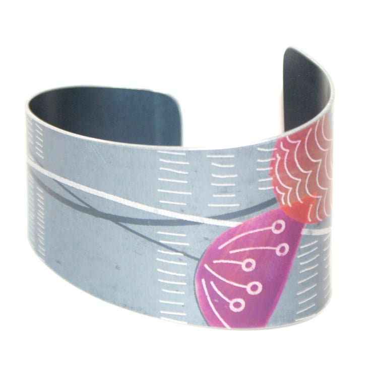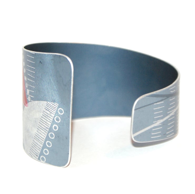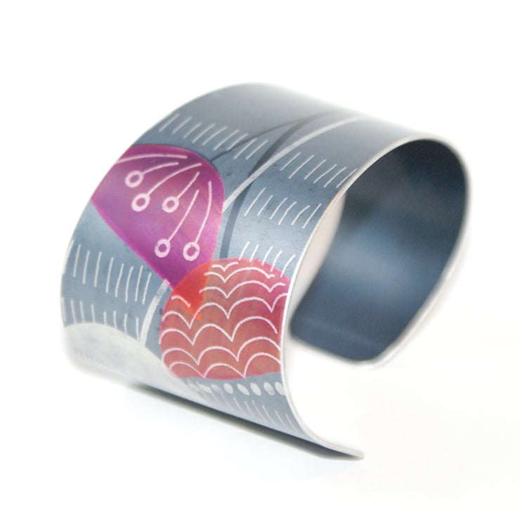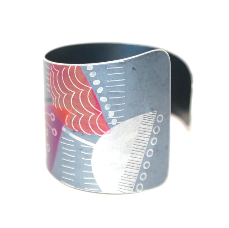 A gorgeous scandi inspired cuff bracelet crafted from anodised aluminium. The pattern originated from a sketch that I transferred to my computer to create resists. These are applied to the metal and then the piece is hand printed and immersion dyed to create the layers of colour. It is then sealed and finished using traditional metalworking ttechniques. The cuff is wide at one end (approx 5cm) and narrow at the other (approx 2cm) creating a sculptural form that looks great on and off.