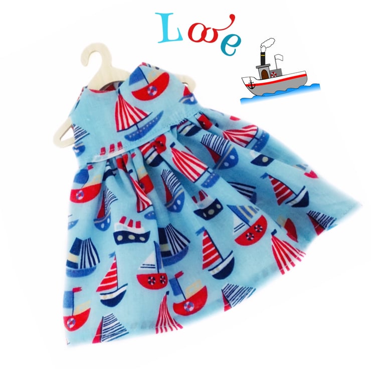 A little blue sailing boat dress to fit the Mulberry Green characters. The dress is made from polyester cotton, has a full skirt, a lined bodice and comes on a cute little wooden hanger.