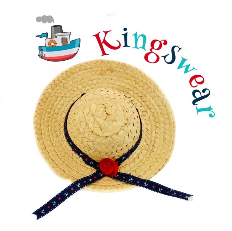 A lovely straw sun hat to fit the Mulberry Green dolls. The hat is decorated with navy ribbon with red anchors and a rolled felt rose and matches the Kingswear dress.