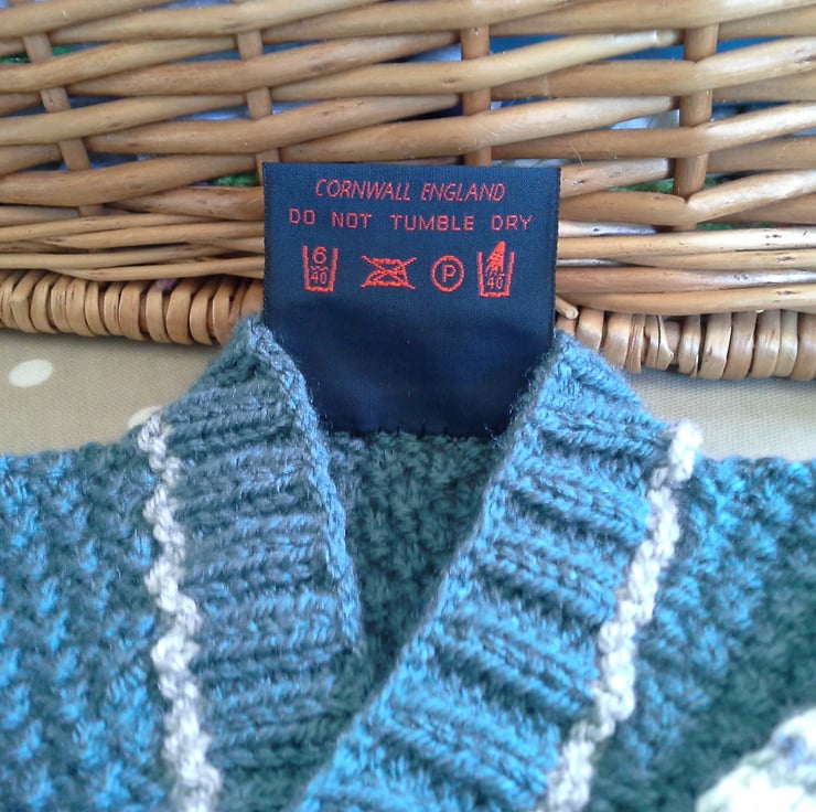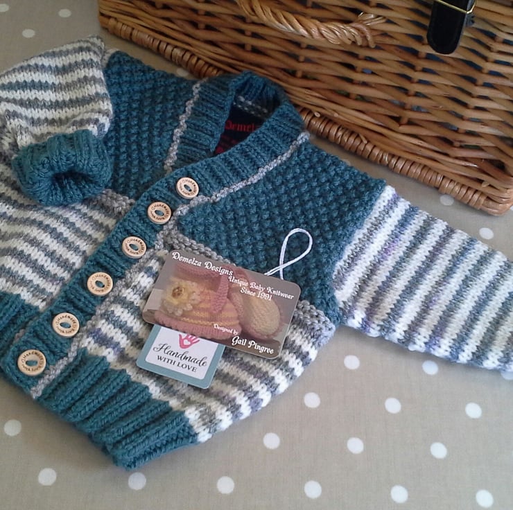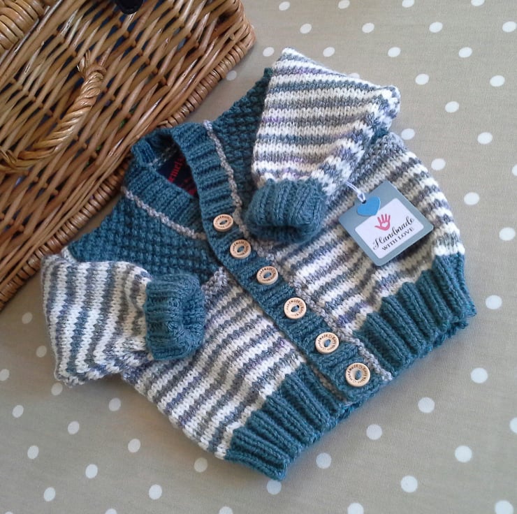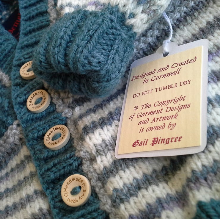 A lovely eye catching baby boys cardigan designed and totally hand crafted in Cornwall. The yarns used are quality premium branded British and French manufactured yarns which are machine washable at low temperatures. This design is my best seller and parents have informed me that they are of the quality to be passed down to babies in their family or for friends baby's. The buttons are made from genuine wood with a sweet sentiment burnt etched on them. The garment has the designer label attached to the back neck edge with the care instructions woven within it.