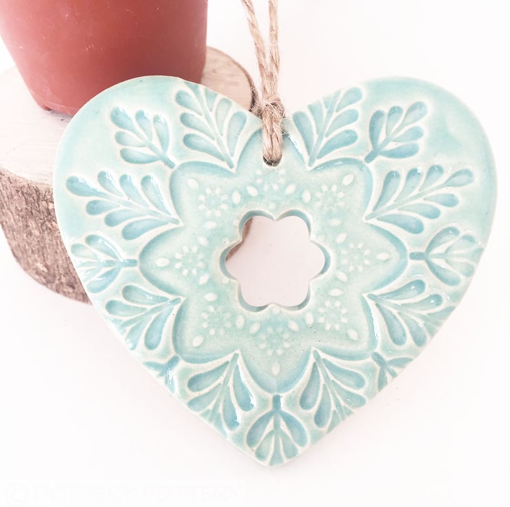 This listing is for ONE BLUE ceramic heart. made from white earthenware clay, imprinted with pattern and finished with a bright, glossy glaze. It has been fired twice, once to the bisque stage and then a second firing for the glaze. It measures 10 centimetres wide and the same in height x 5mm thick. It can be hung outside.