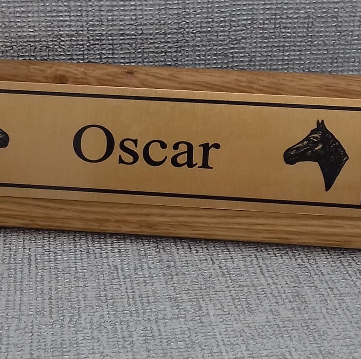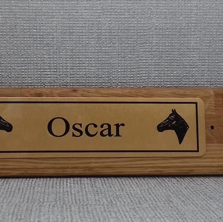 New quality Personalised Stable door sign made from silver anodised aluminium, and mounted on a solid oak wooden plinth.