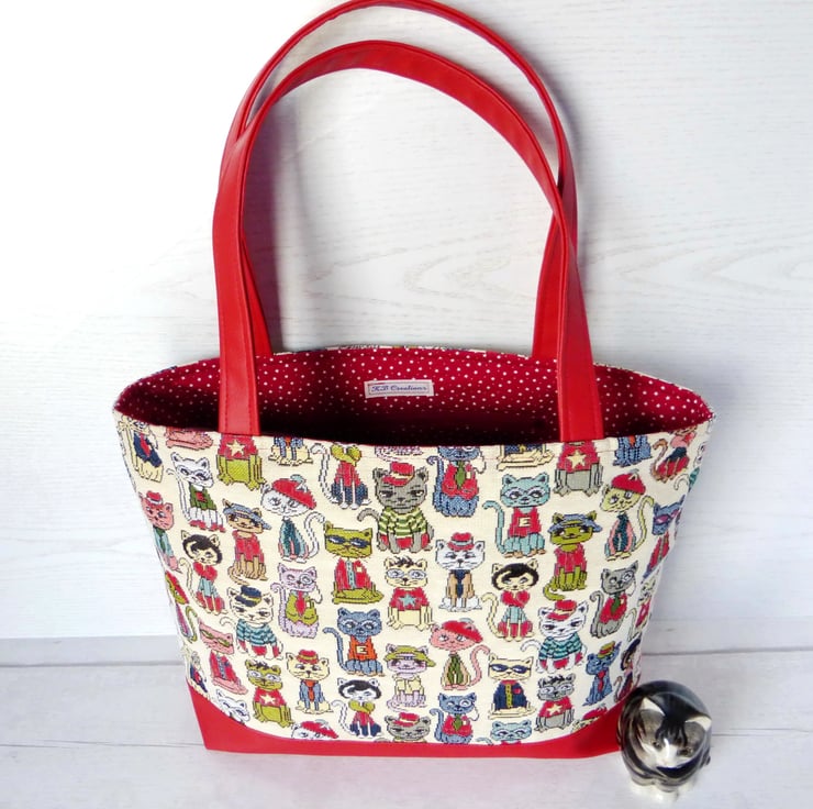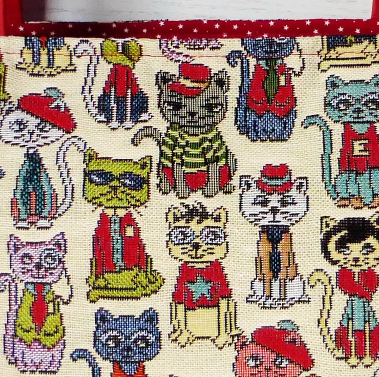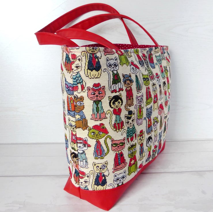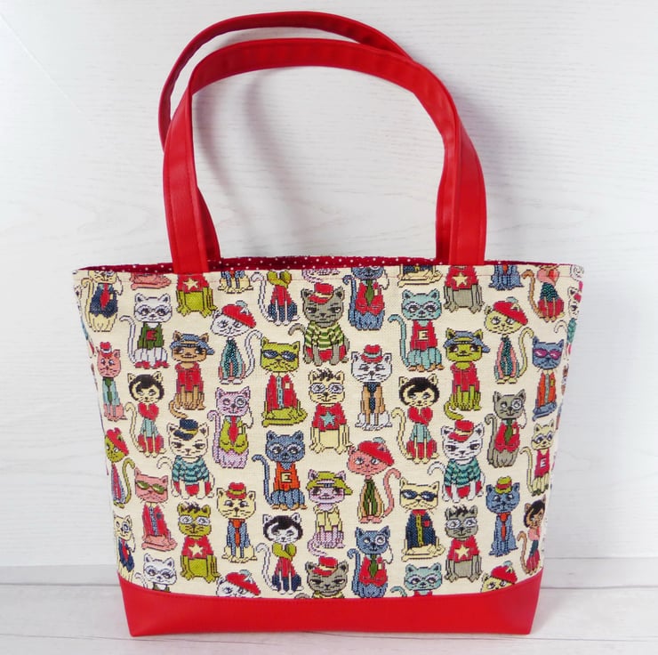 A tote bag made from a tapestry canvas fabric with a comical cat design of dressed up cats, and red faux leather.