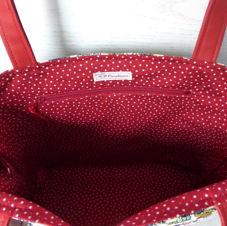 The cat design fabric is multi coloured cats on a cream background and is 80% cotton, 20% polyester. The lining is 100% cotton in dark red with a white star design on it.