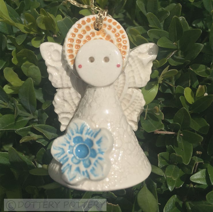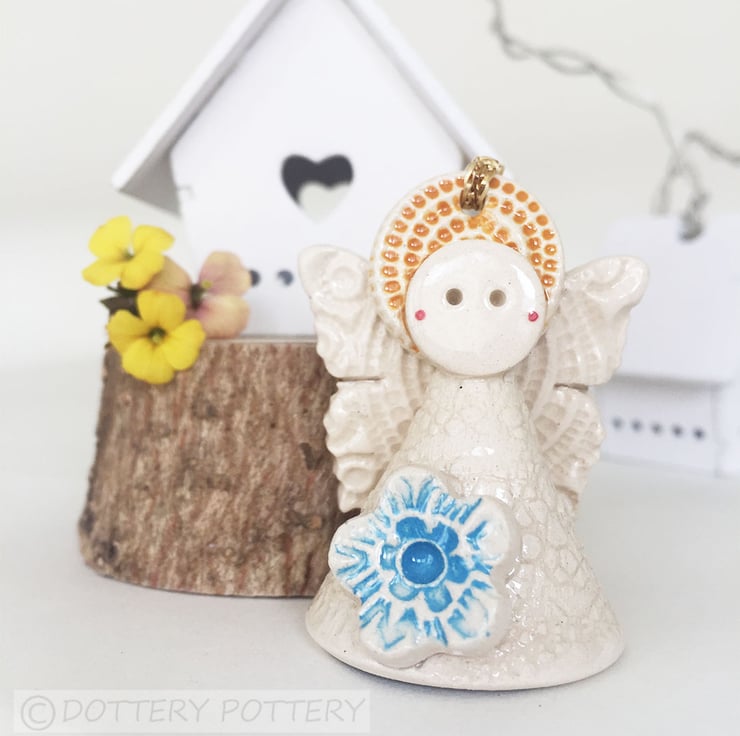This tiny little ceramic fairy is made from white earthenware clay. She has a little cream dress with a flower motif and a cute little button at the back. She can hang or be a free standing ornament. She measures 5cm high x 4cm wide