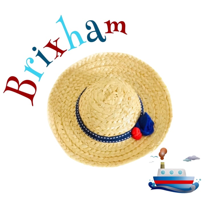 A lovely straw sun hat to fit the Mulberry Green dolls. The hat is decorated with navy braid, a blue rolled rose and red pom poms. It matches the Brixham dress.