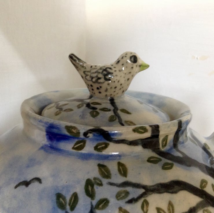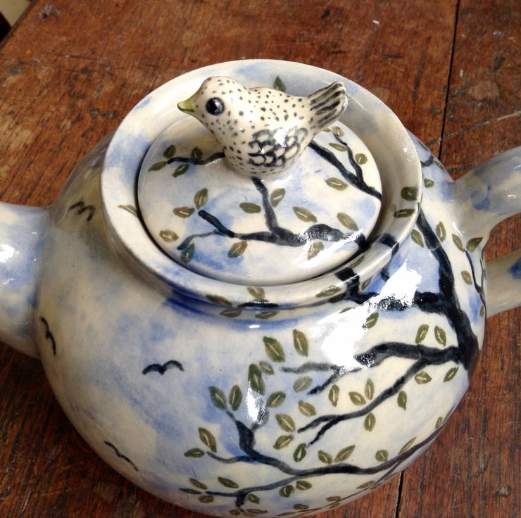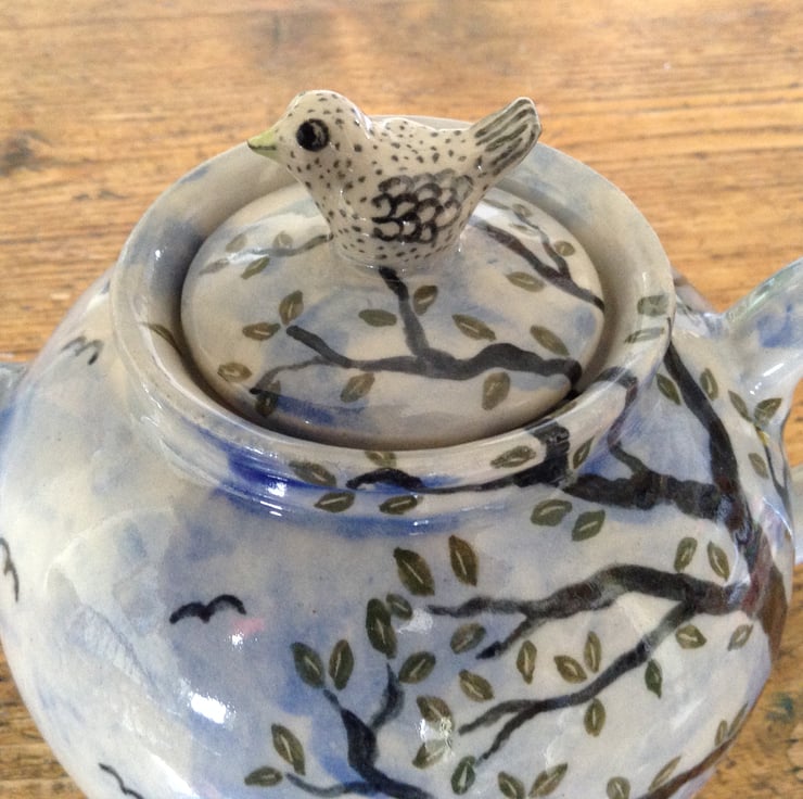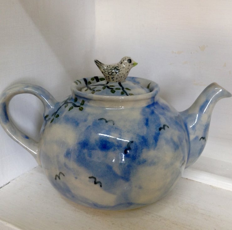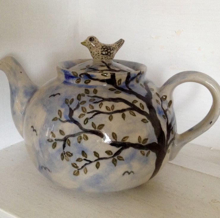 Very pretty and unusual handmade stoneware teapot with a little hand modelled bird on the lid. It is decorated with a tree with green leaves and a background of sky, clouds and birds. It holds about 2 pints and is 13 cms high and about 21 cms wide (including the spout and handle). It is made from highfired stoneware clay and is dishwasher and microwave safe.