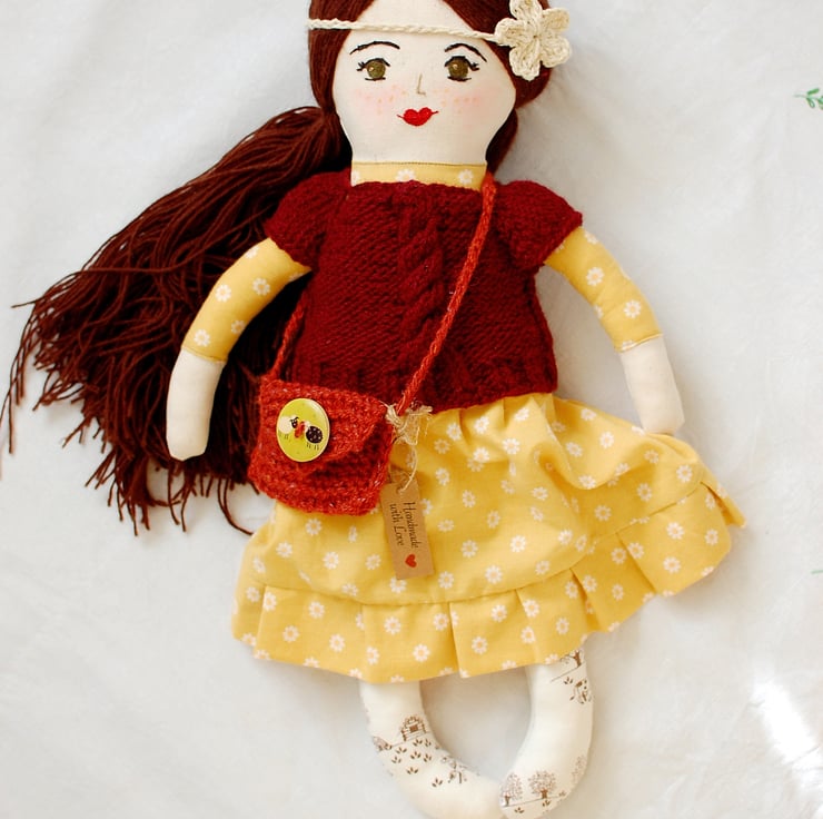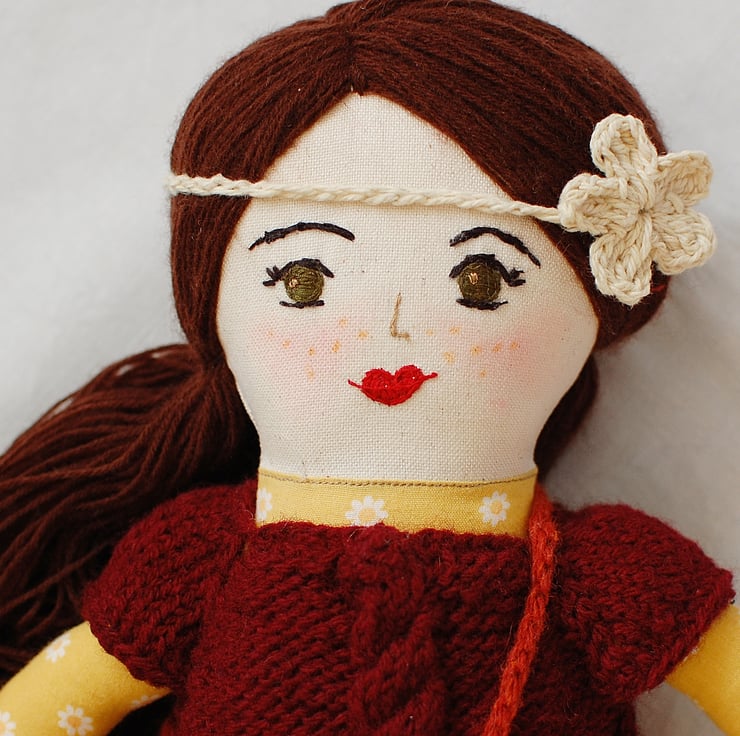 Facial features have been lovingly embroidered freehand. Her hair is made out of soft yarn.