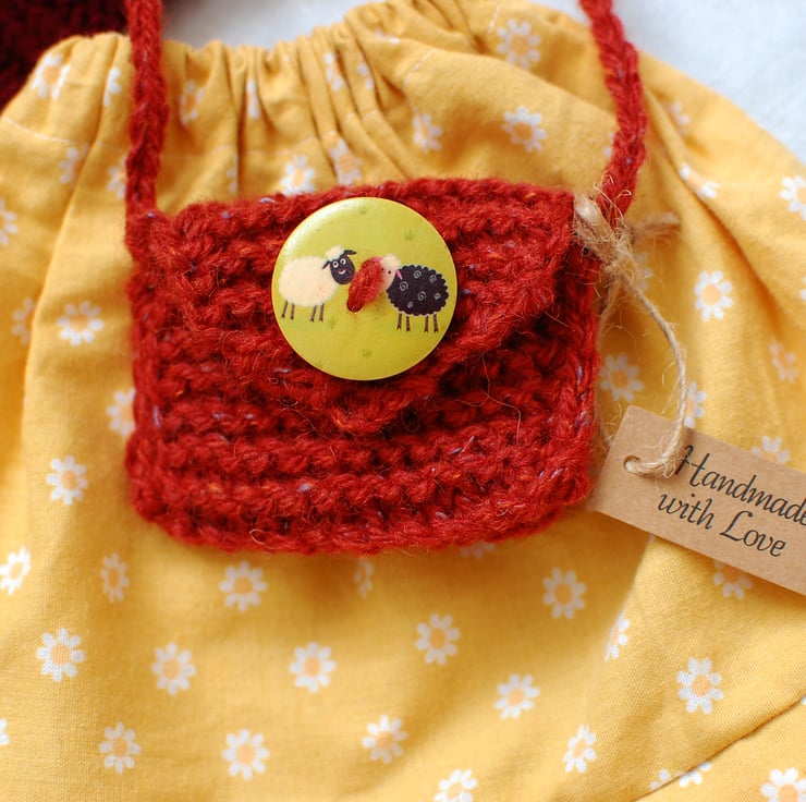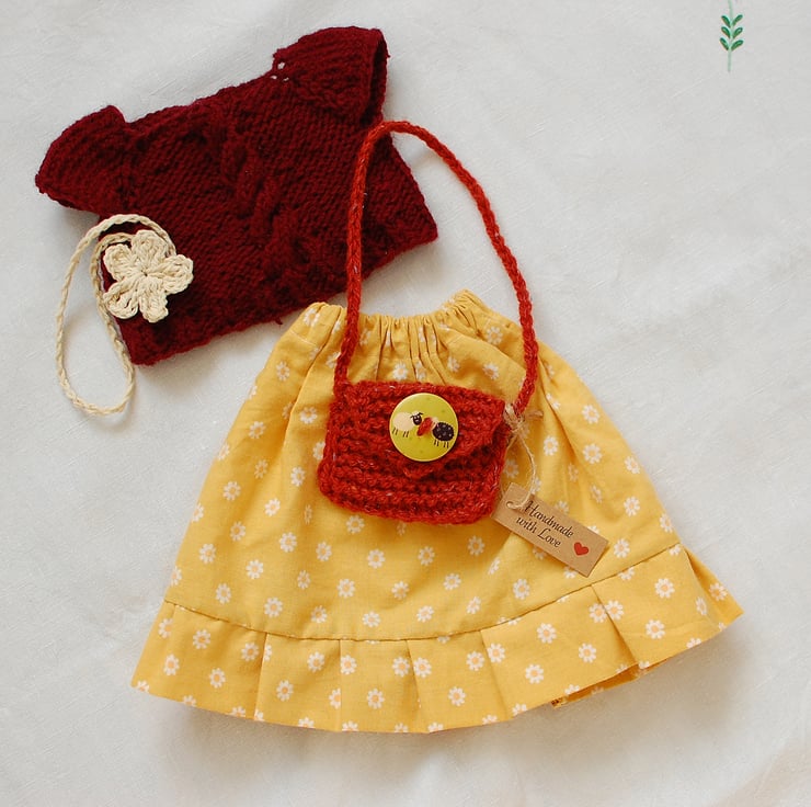 Morag's sweater is hand knitted out of soft pure wool. The skirt is made of soft cotton fabric with beautiful pattern. Morag has a beautiful bag with a cute button.