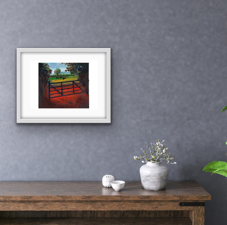 Invited with Art club to a members farm to paint. I liked the idea that over the gate was a view and I was experiencing this. The colours in the foreground I used artistic licence although leaves had dropped.!