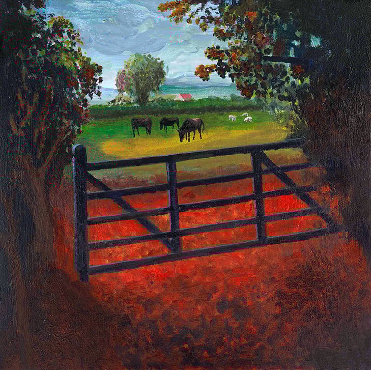 Over the farm gate. The five bar gate silhouettes on the vibrant red ground and between the trees on either side. Over the gate are cows and sheep grazing on the yellow and green grass. Beyond a hedge a red rooftop can be seen with distant hills up into the sky.