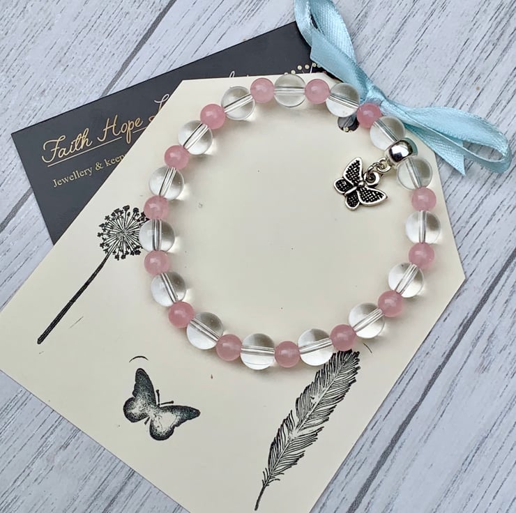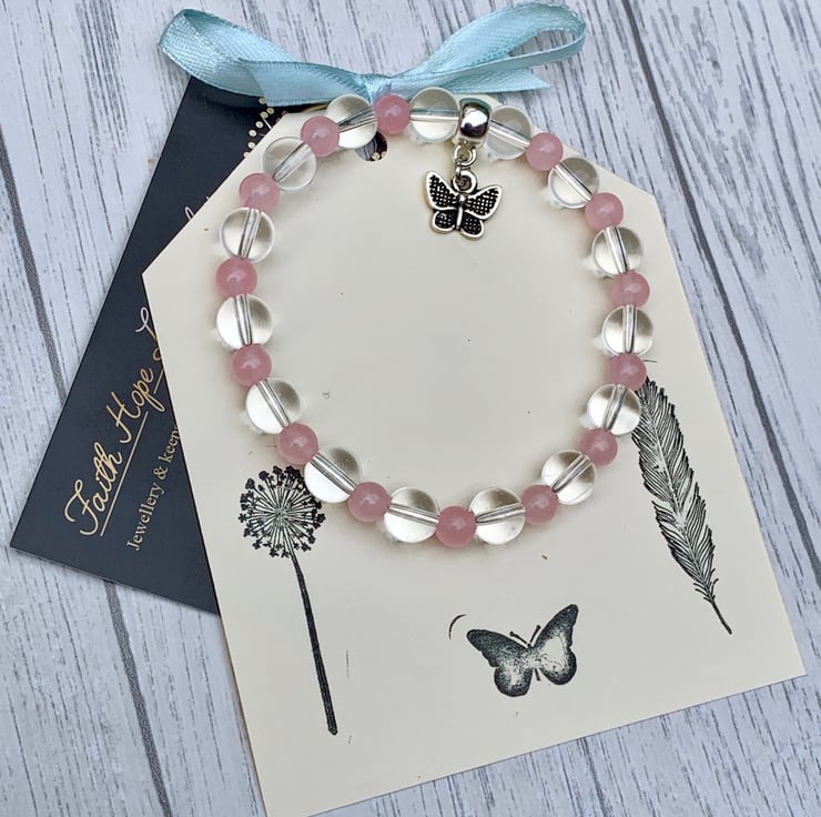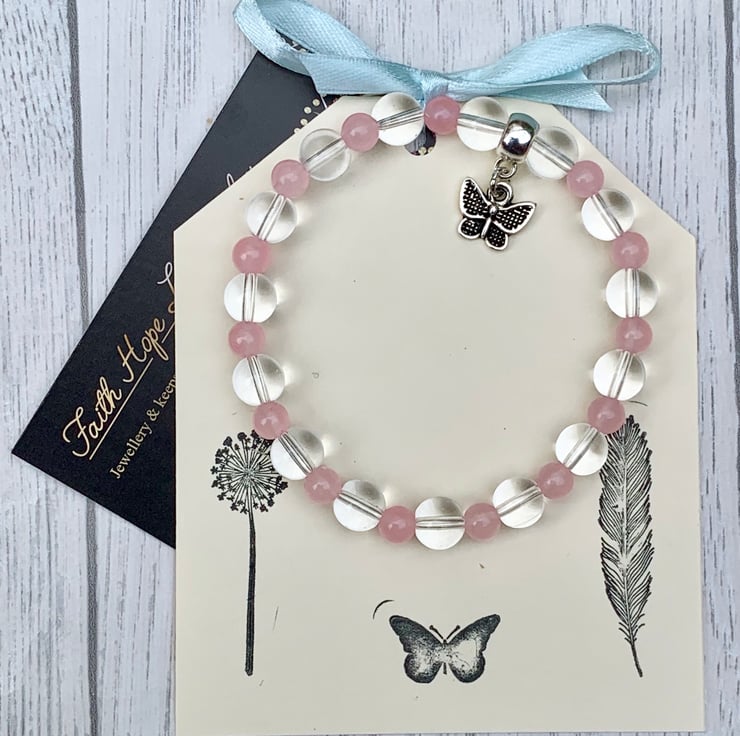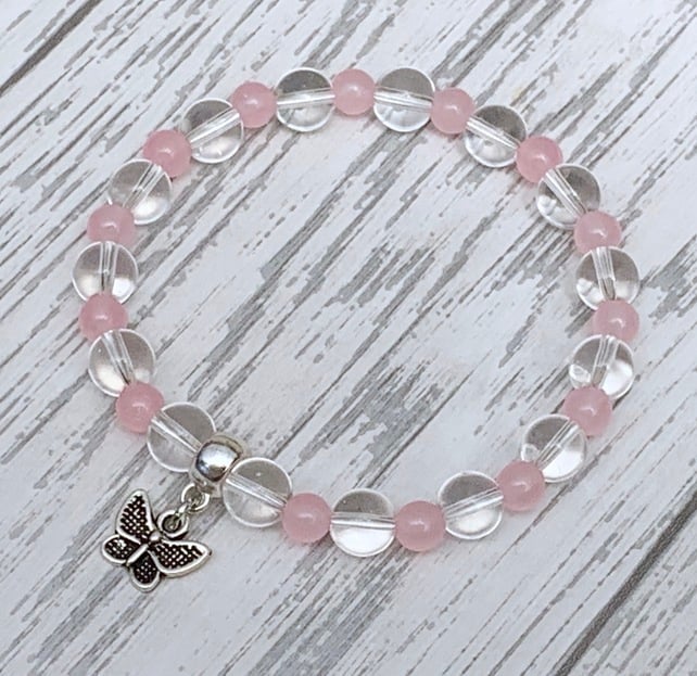 Anxiety Relief Rose Quartz & Clear Quartz Butterfly Healing Bracelet