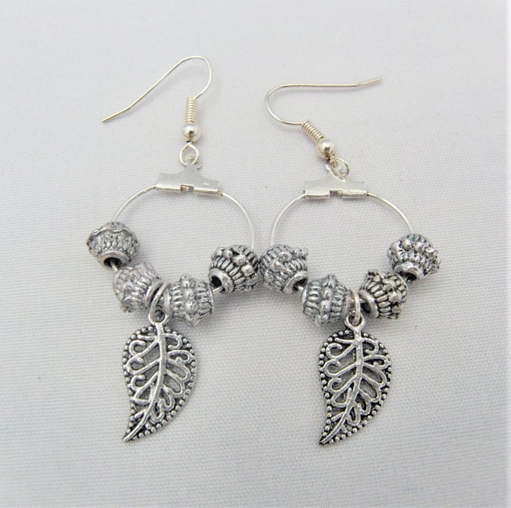 The hoop earrings are made 6 mm "Saturn" style silver plated spacer beads with a silver plated leaf charm on a silver plated 22 mm hoop with silver plated Fish Hooks they have a drop of 4.5 cm.