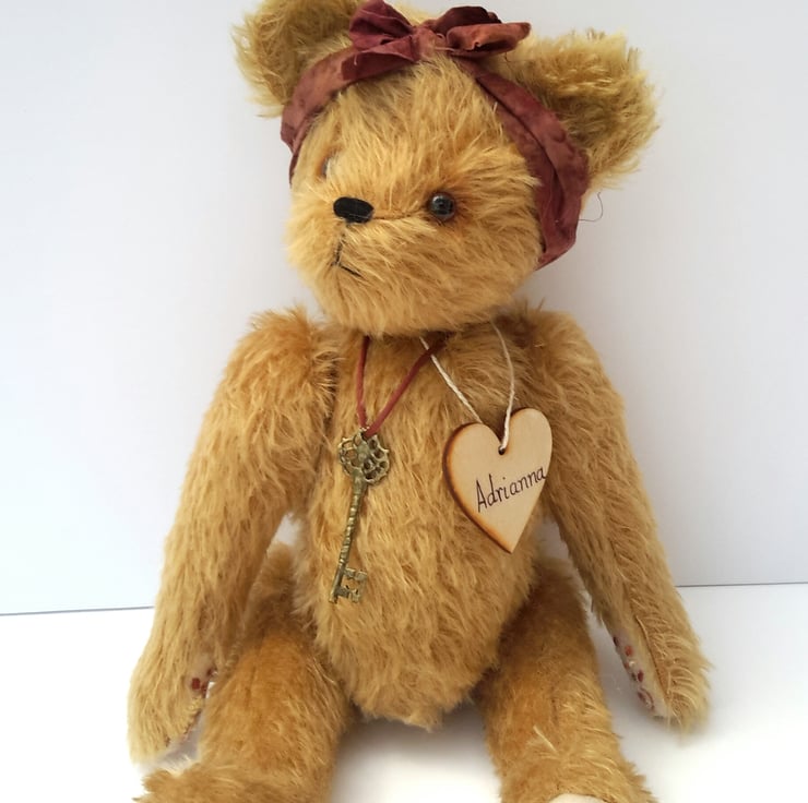 This is Adrianna, a 16" tall traditionally styled, bespoke mohair bear with delicate hand embroidery, cotter pin joints and safety eyes, lovingly designed and created by Bearlescent.