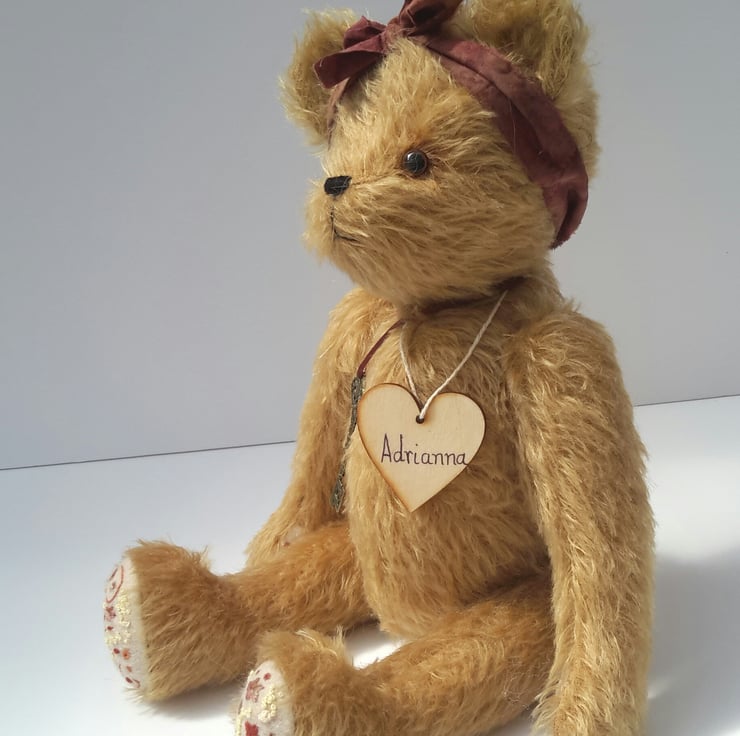 Adrianna wears her name on a wooden heart and Bearlescent is to the back of one ear on a polymer clay button.