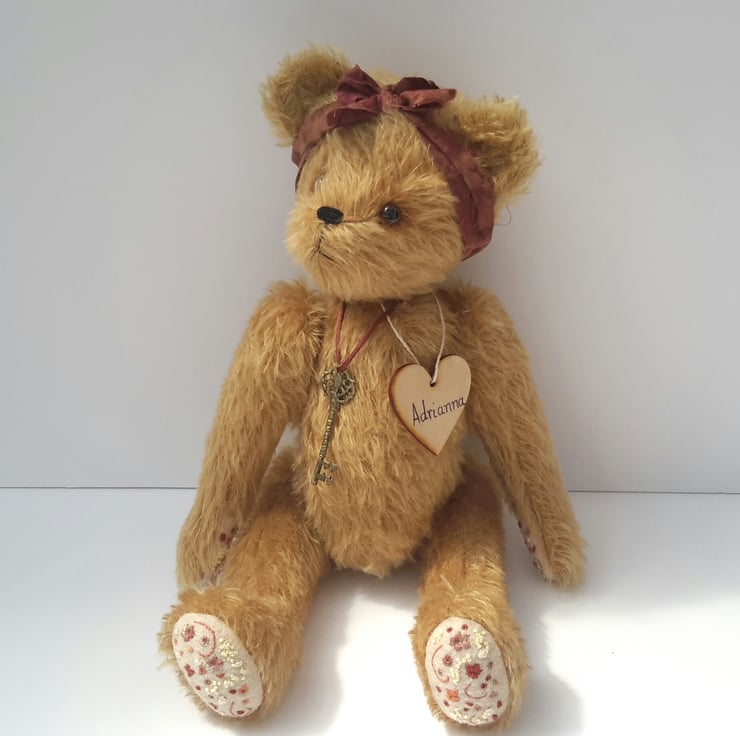 This is Adrianna, a 16" tall traditionally styled, bespoke mohair bear with delicate hand embroidery, cotter pin joints and safety eyes, lovingly designed and created by Bearlescent.