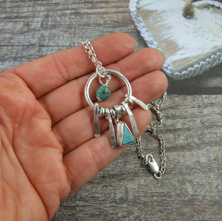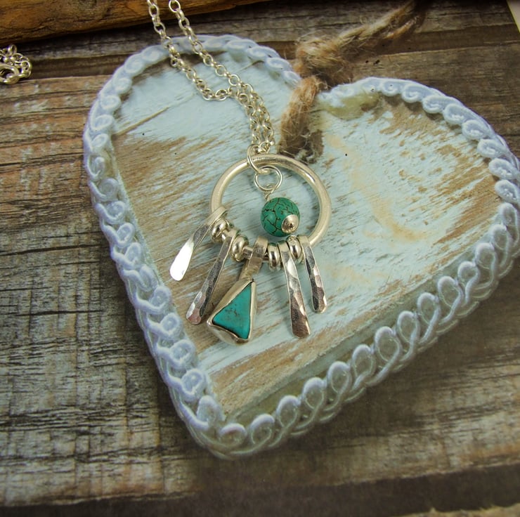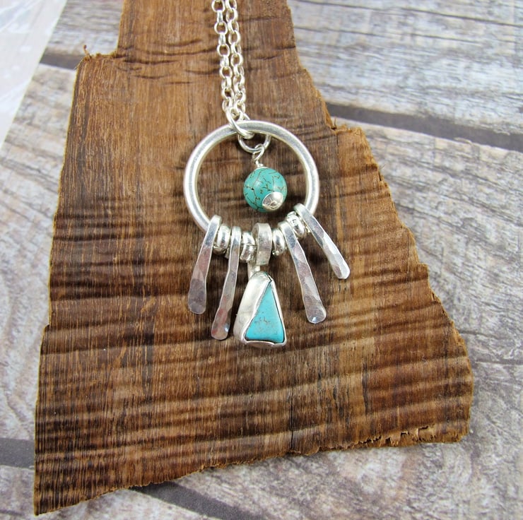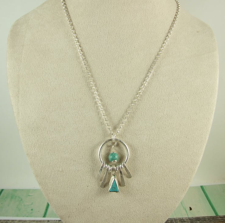 Hand forged Sterling Silver circle made from 2mm thick silver, fitted with Turquoise Gemstone Bead and hammered silver teardrops and a triangle piece of turquoise set in a silver bezel. Fitted to 20in sterling silver rolo chain. Pendant measures approx 1.5 inches wide by 2 inches long. Fully hallmarked at the London Assay Office.