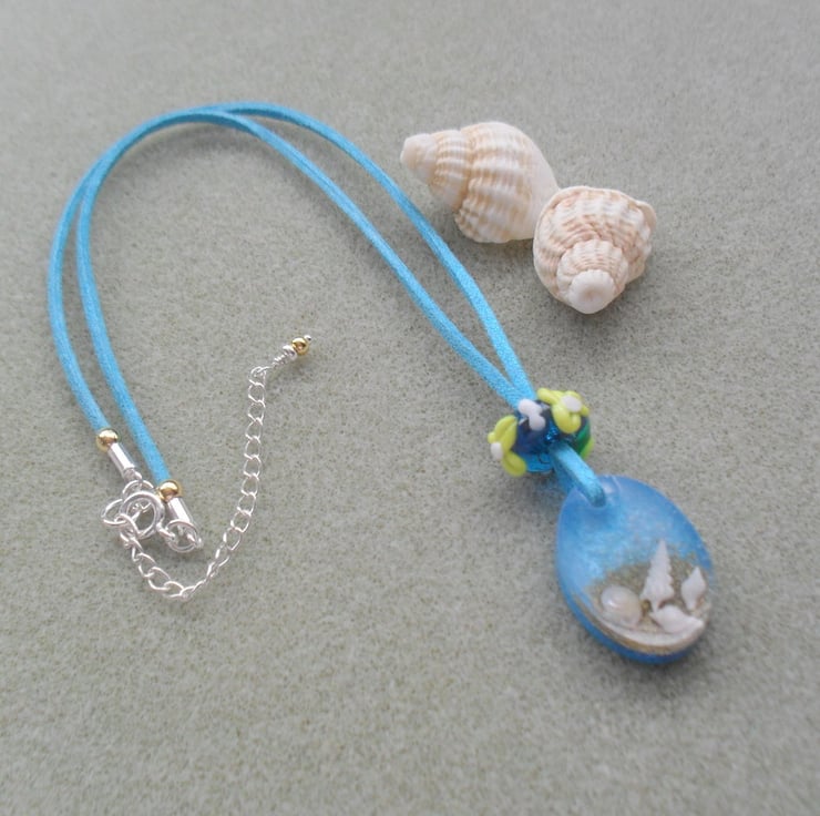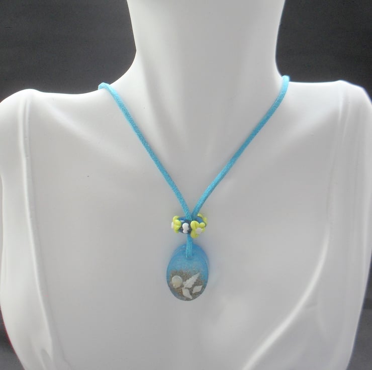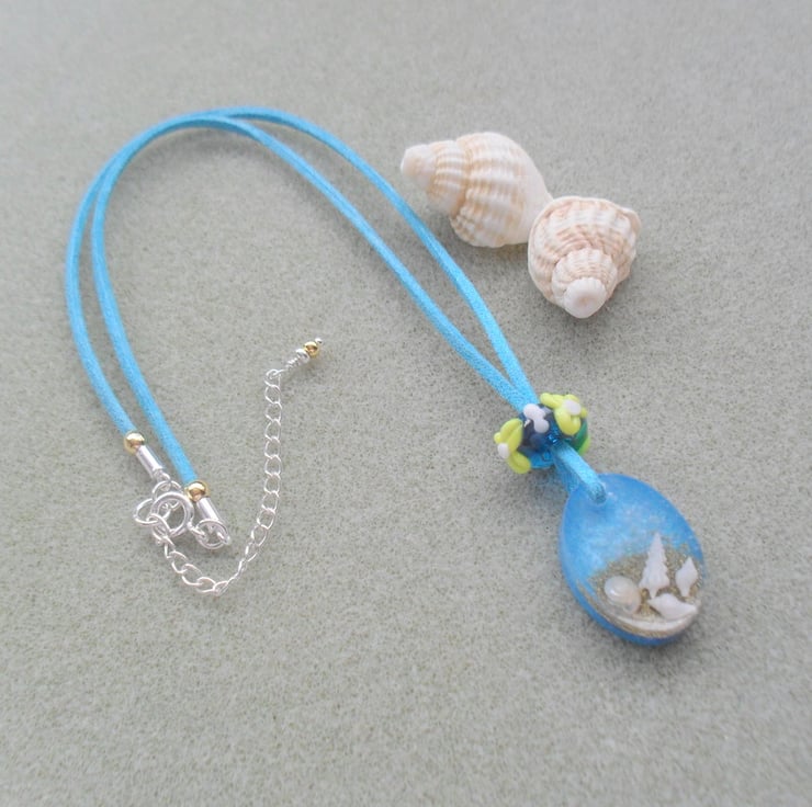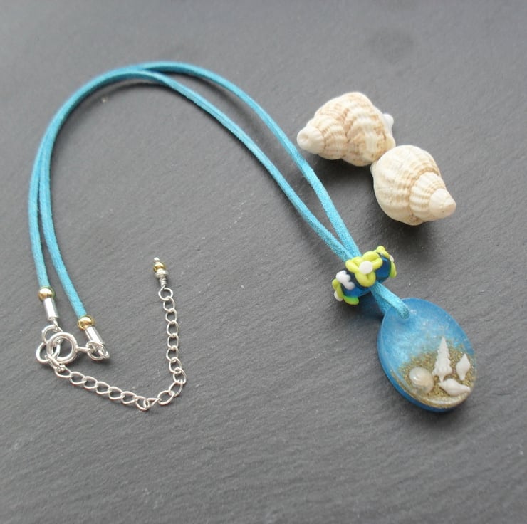 This pendant has been made with tiny shells which have been captured in resin and attached to a faux suede blue cord the cord has a little glitter which gives it a bit of sparkle. The pendant has a handmade lampwork glass bead on the cord .