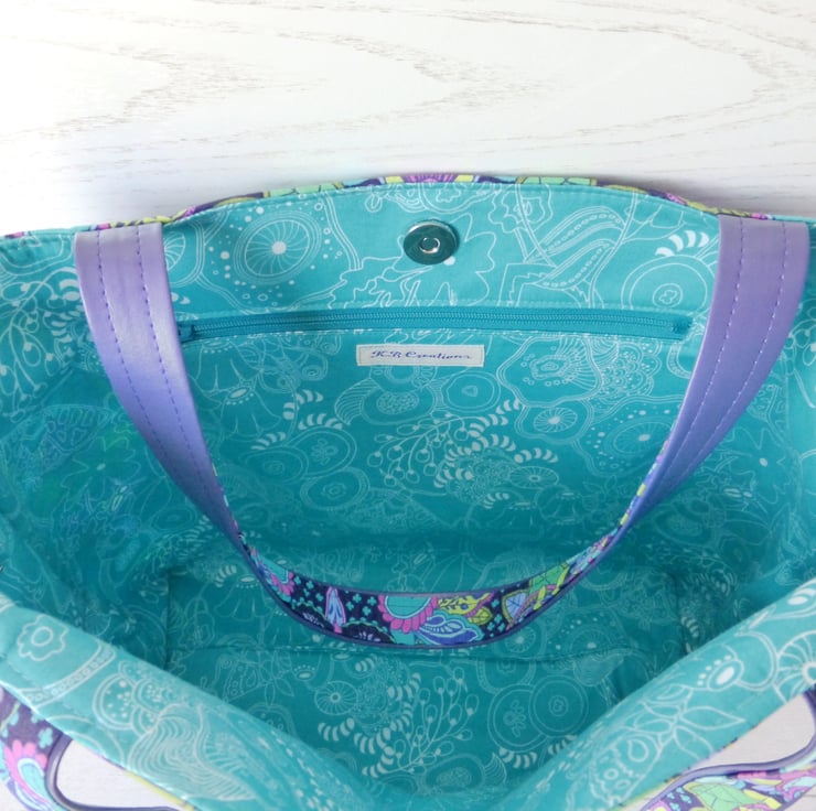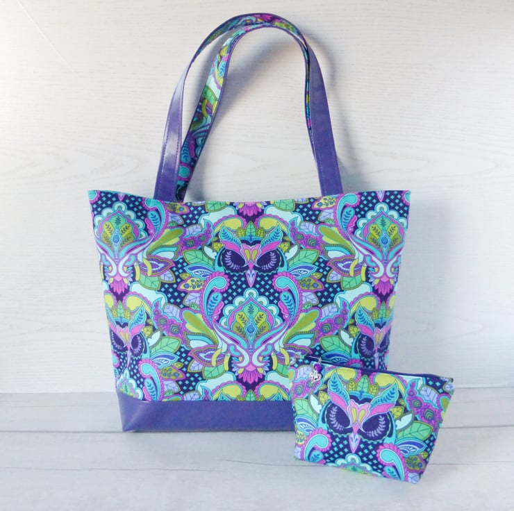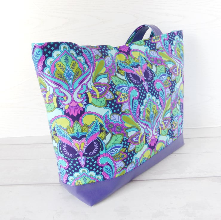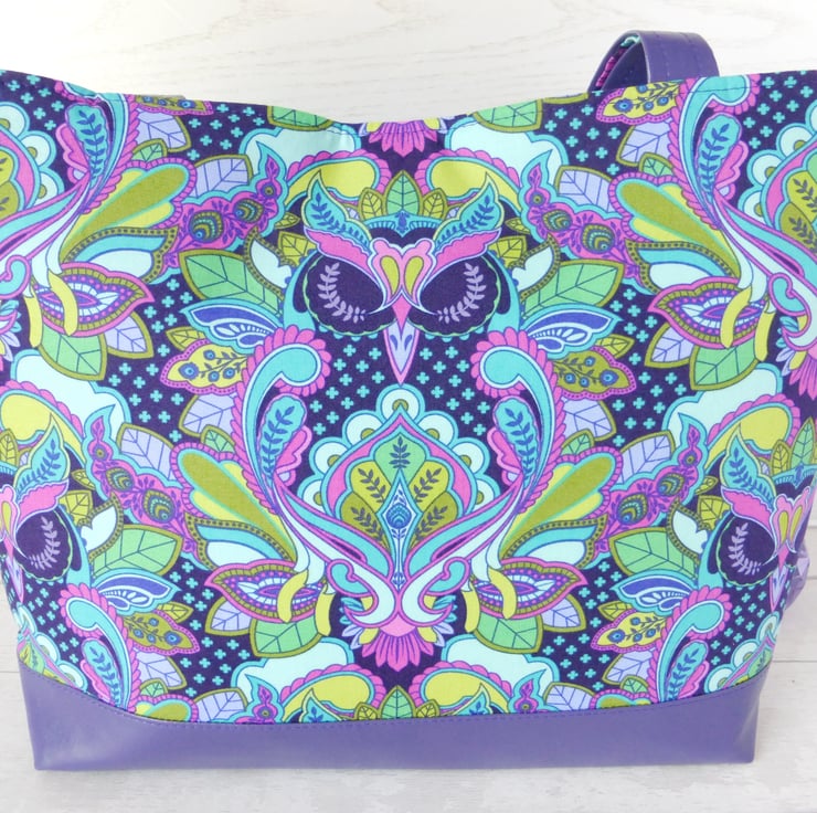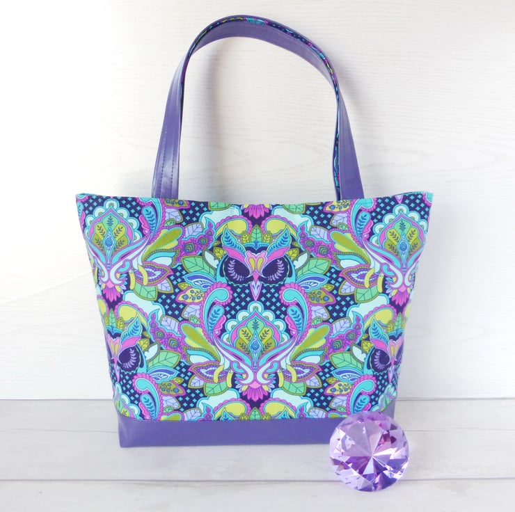 A tote bag made from a cotton fabric with a striking owl design by Tula Pink, and purple faux leather. The owl design fabric is !00% cotton in shades of purple, turqoise, pink and green..