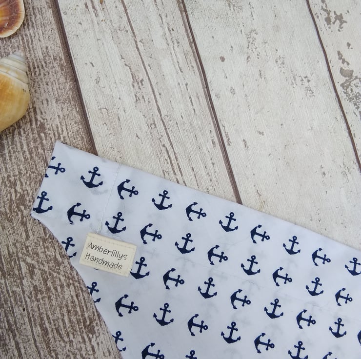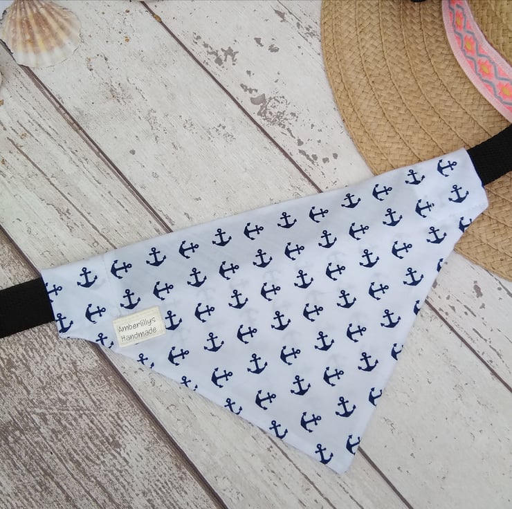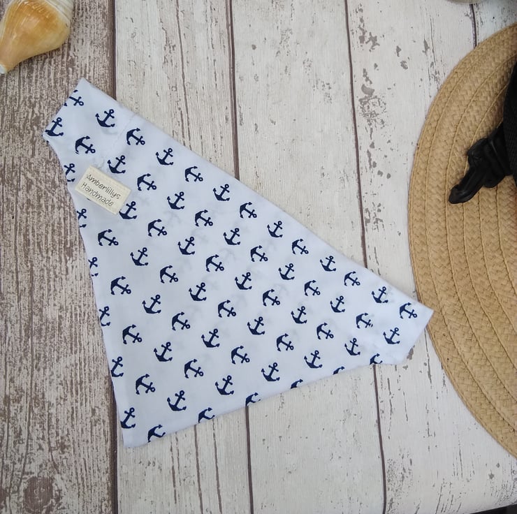 A nautical themed small dog bandana, over the collar style, for ease of wear and to look super cool! In easy care poly cotton and is double sided. Navy blue anchors on a white background. A cute addition to your dogs wardrobe.
