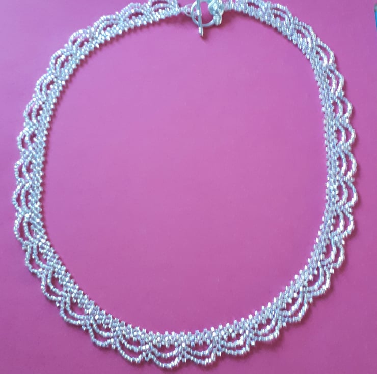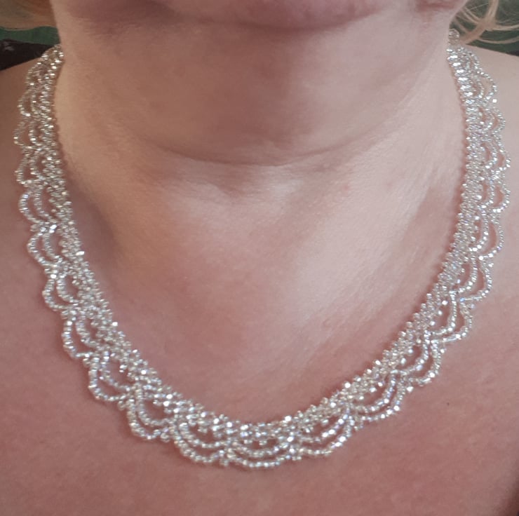 Lacy look necklace made with silver lined AB crystal seed beads which drapes gracefully around the neck. It is light and comfortable to wear. It measures approx 51.5m / 20.5” long and fastens with a pretty rose design, silver tone toggle clasp. Looks great on.
