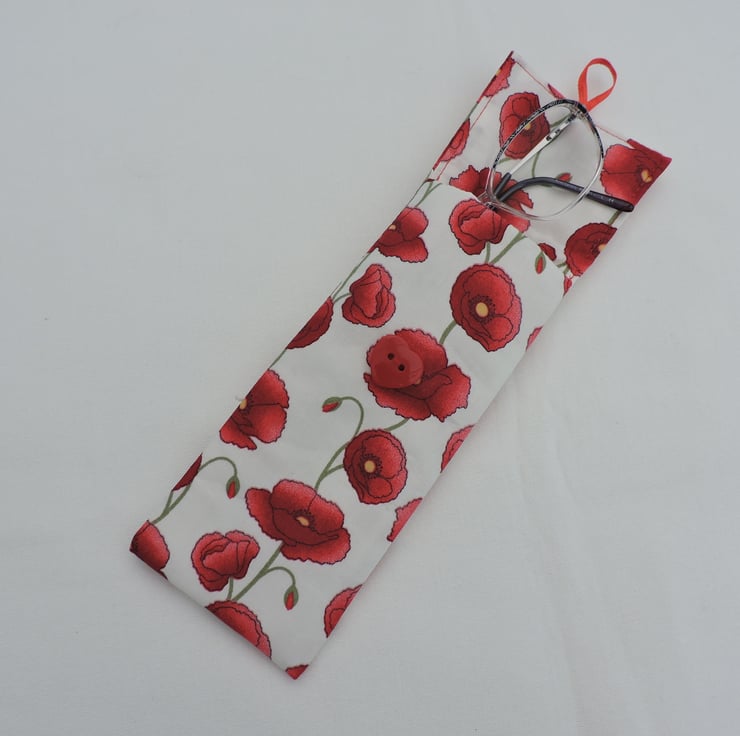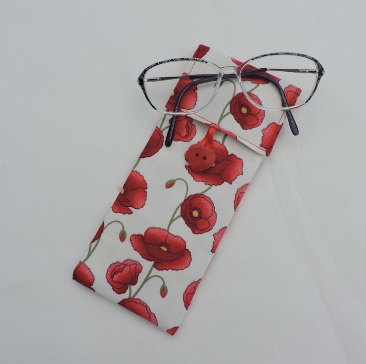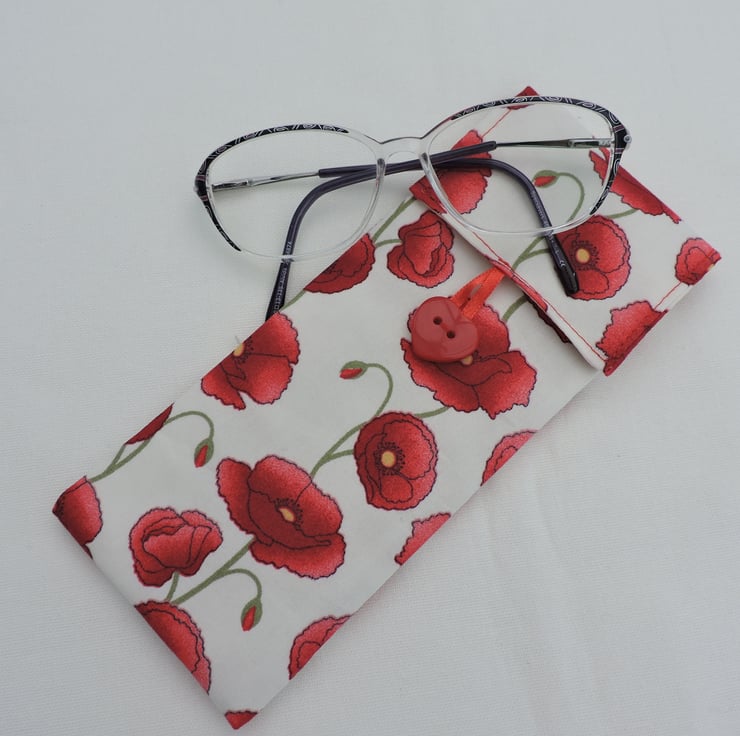 This glasses case or sun glasses case has been made with a pretty cotton fabric with ruby red poppies on a white background. I've used a fusible fleece to give the case padding and finished the case with a flap over top fastened with a red heart shaped button and ribbon loop.