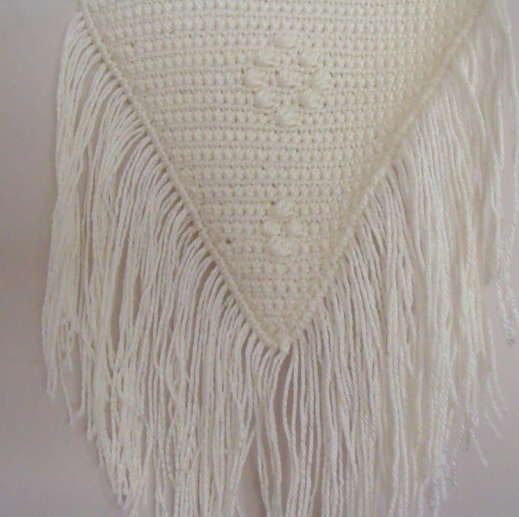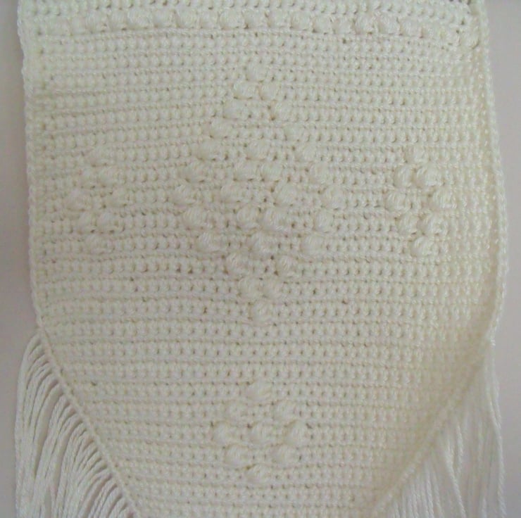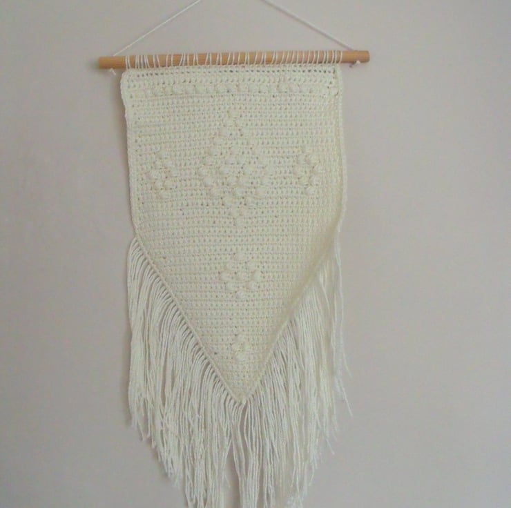 Here we have a crocheted fringed wall hanging with diamond pattern.