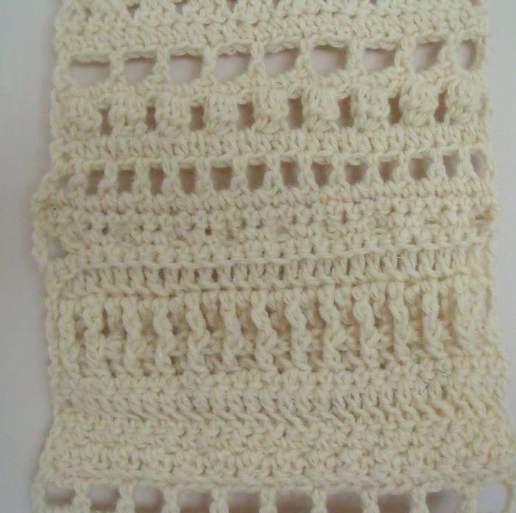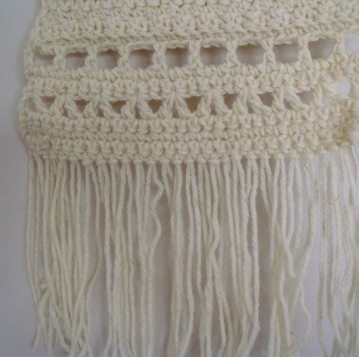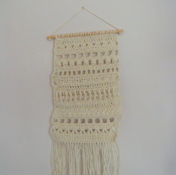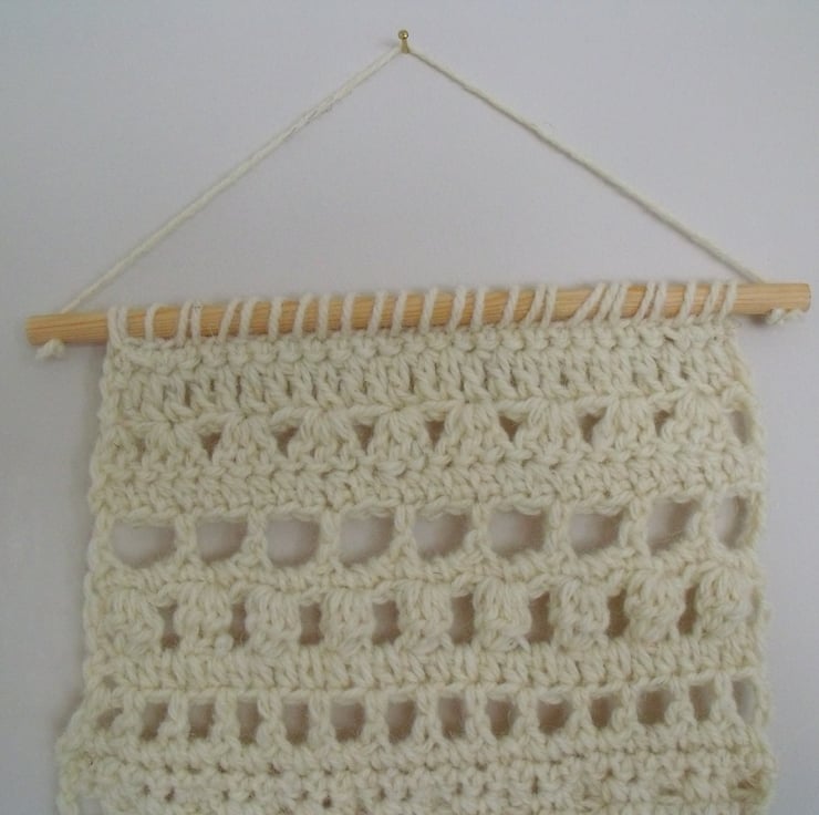 Here we have a crocheted fringed wall hanging where I've used lots of different crocheted stitches to create texture and interest.