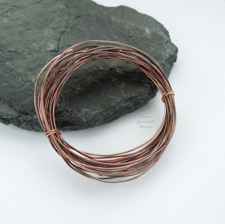 1 x3m length of solid copper wire, which I clean, antique (using liver of sulphur) and rub down with steel wool. Then I apply two coats of Renaissance wax to protect the finish, and polish for shine.
