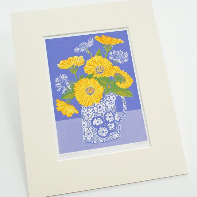 'Allotment Flowers'.Original, hand printed limited edition linocut reduction print, titled, 'Allotment Flowers', printed on a hand press in seven hand blended ink colours. Signed, numbered and titled in pencil by the artist.