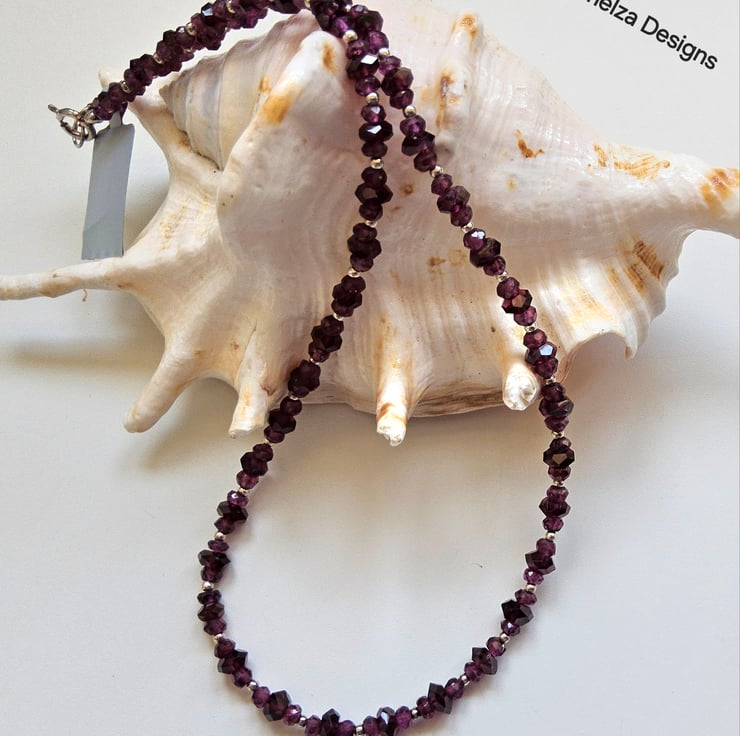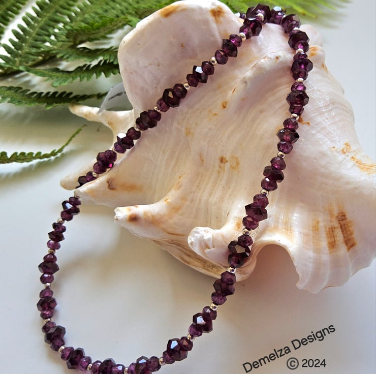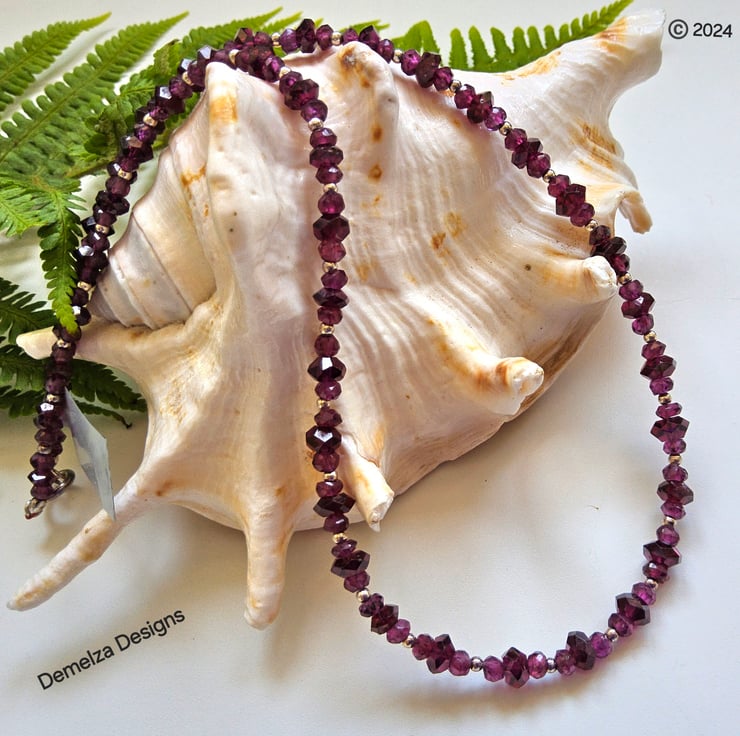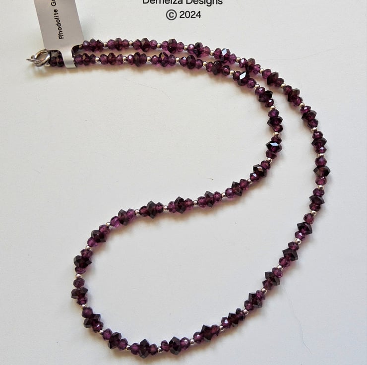 A beautiful rare opportunity to purchase a genuine rhodolite garnet gemstone necklace with exceptional colour and clarity for their sizes. It has been hand created and designed using faceted rondelle gemstones with 2mm sterling silver beads within the design.
