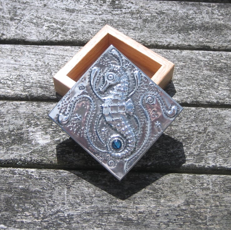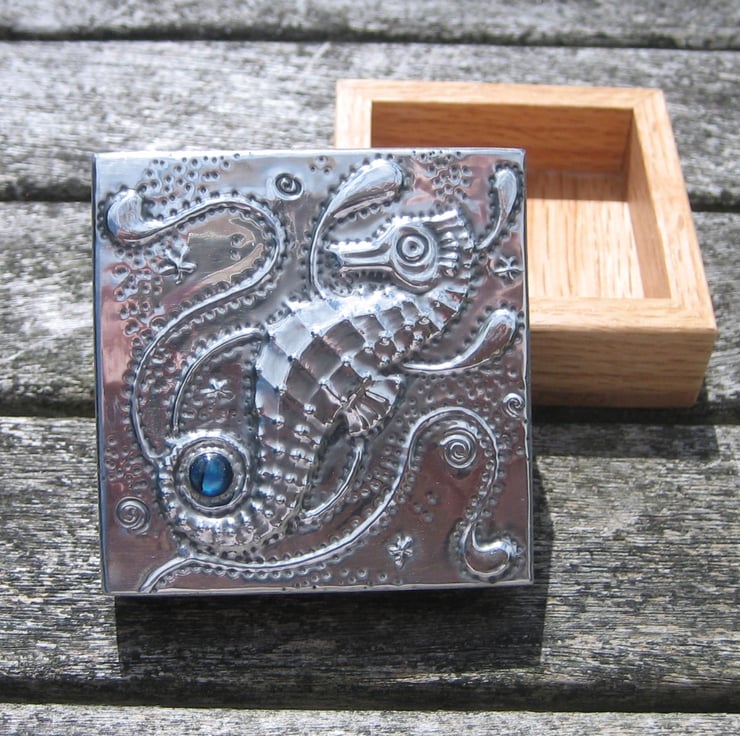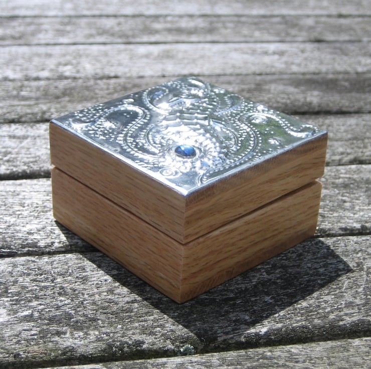 A beautiful hand embossed seahorse adorns the lid of this little square oak wood box. Fronds of seaweed surround little creature, whose tail encircles a lovely blue abalone shell cabochon. This unique little box, hand crafted in silver pewter, is perfect for rings,earrings or tiny trinkets. It measures 6cm x 6cm and is 3.5cm high overall. The inner compartment is 3.9cm square and 2cm deep (will accommodate items up to 2.7cm high with the lid on).