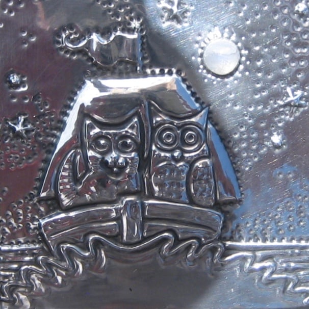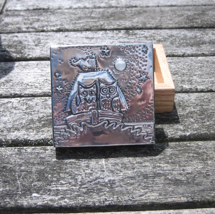 A rainbow moonstone lights the way to the Land where the Bong Tree grows for Edward Lear's popular little characters. A lovely silver scene, handmade in pewter, adorns this simple little square oak box. The Owl and the Pussycat sail into their shared future. This unique little hand-crafted box measures 6cm x 6cm and is 3.5cm high overall. The inner compartment is 3.9cm square and 2cm deep (will accommodate items up to 2.7cm high with the lid on). This rainbow moonstone is not the most colourful, but glimpses of blue can be seen when the light shines through.
