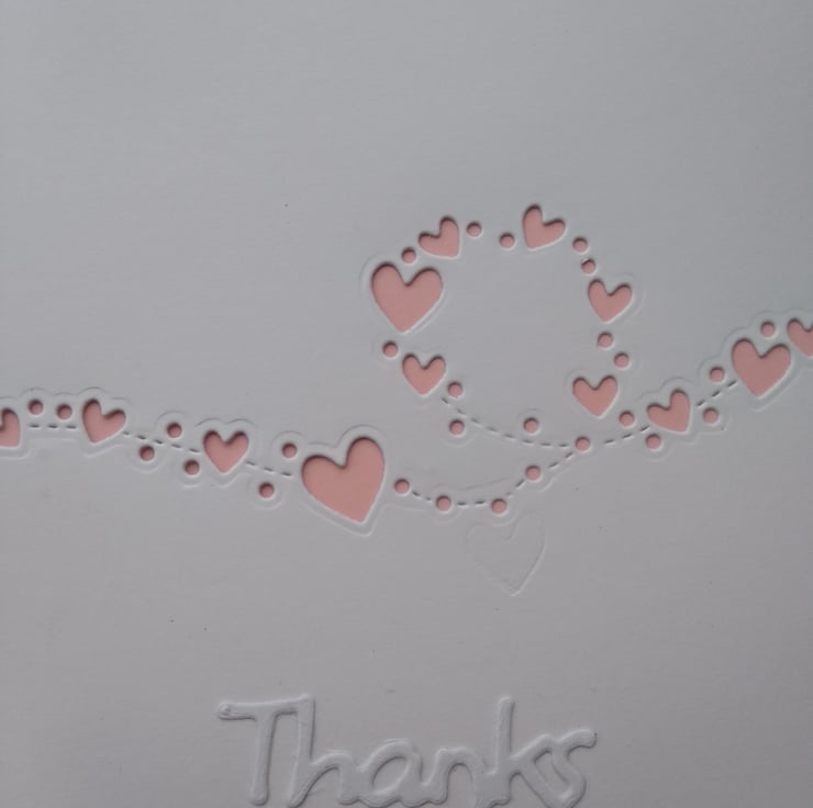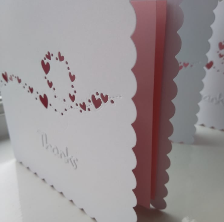 A pack of 3 same design and colourway thank you cards. Consisting of quality pristine white card with three scalloped edges. A swirl of hearts had been die cut across the front allowing the insert paper to show through. Finished off with thanks die cut from white card.