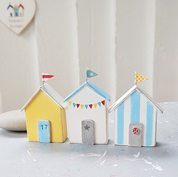 These mini wooden beach huts have been handpainted in off-white, sunny yellow and sky blue, with the addition of handpainted stripes and bunting.